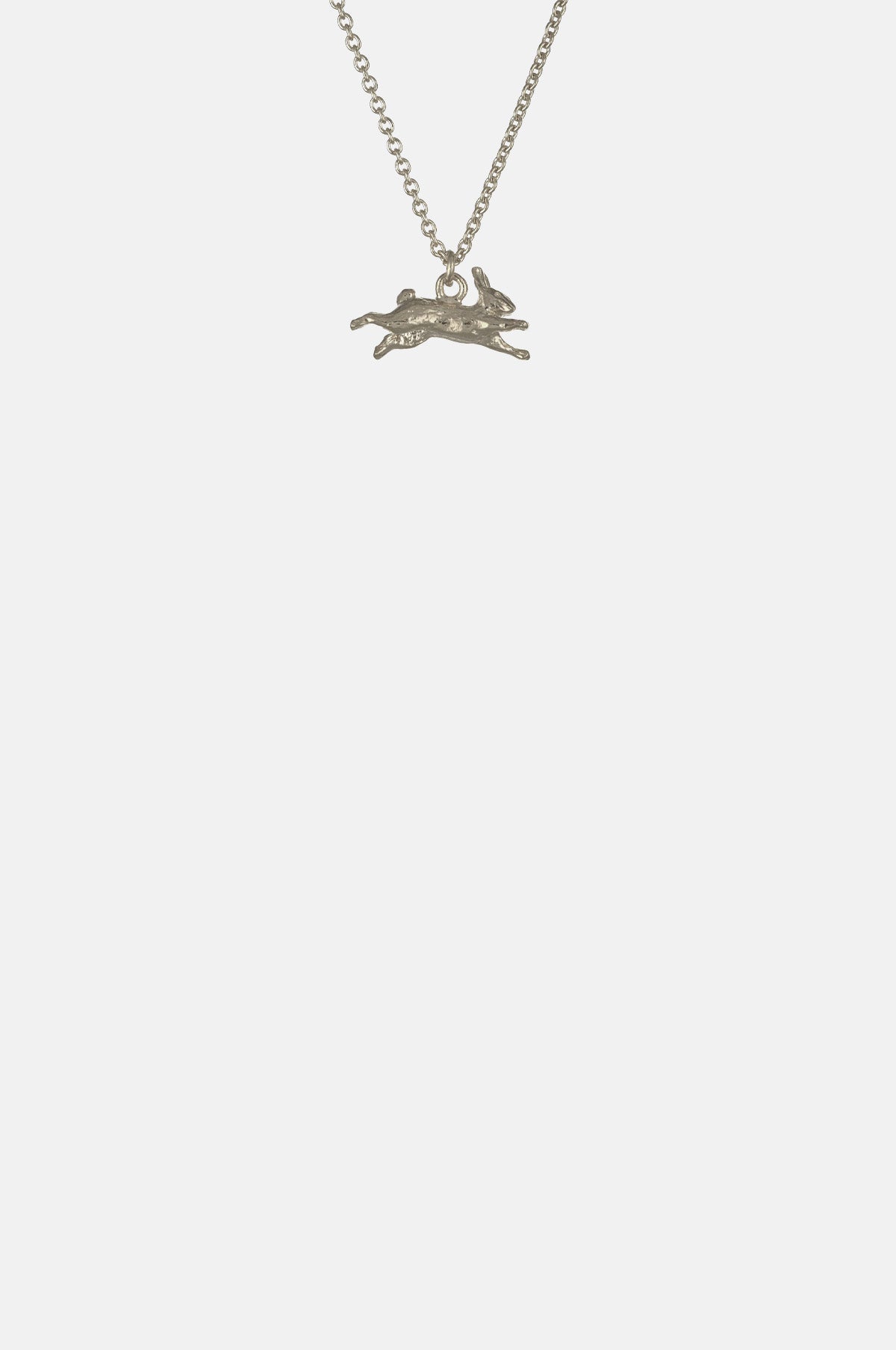In this sweet pendant necklace, a playful silver rabbit gambols through the countryside, leaping over fences. Delightfully small in scale and utterly charming.