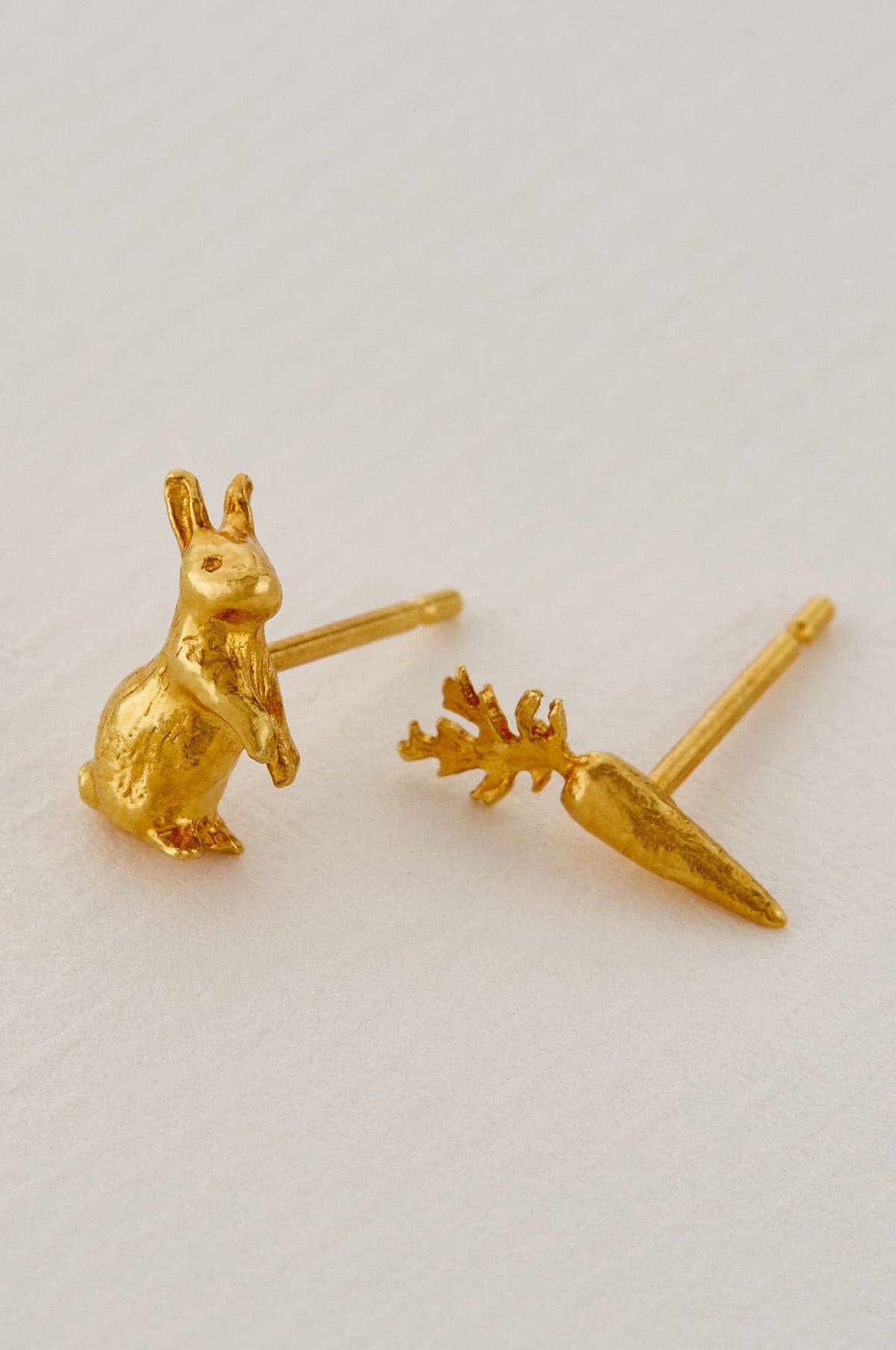 - Gold plated sterling silver stud earrings with asymmetric carrot and sitting rabbit design