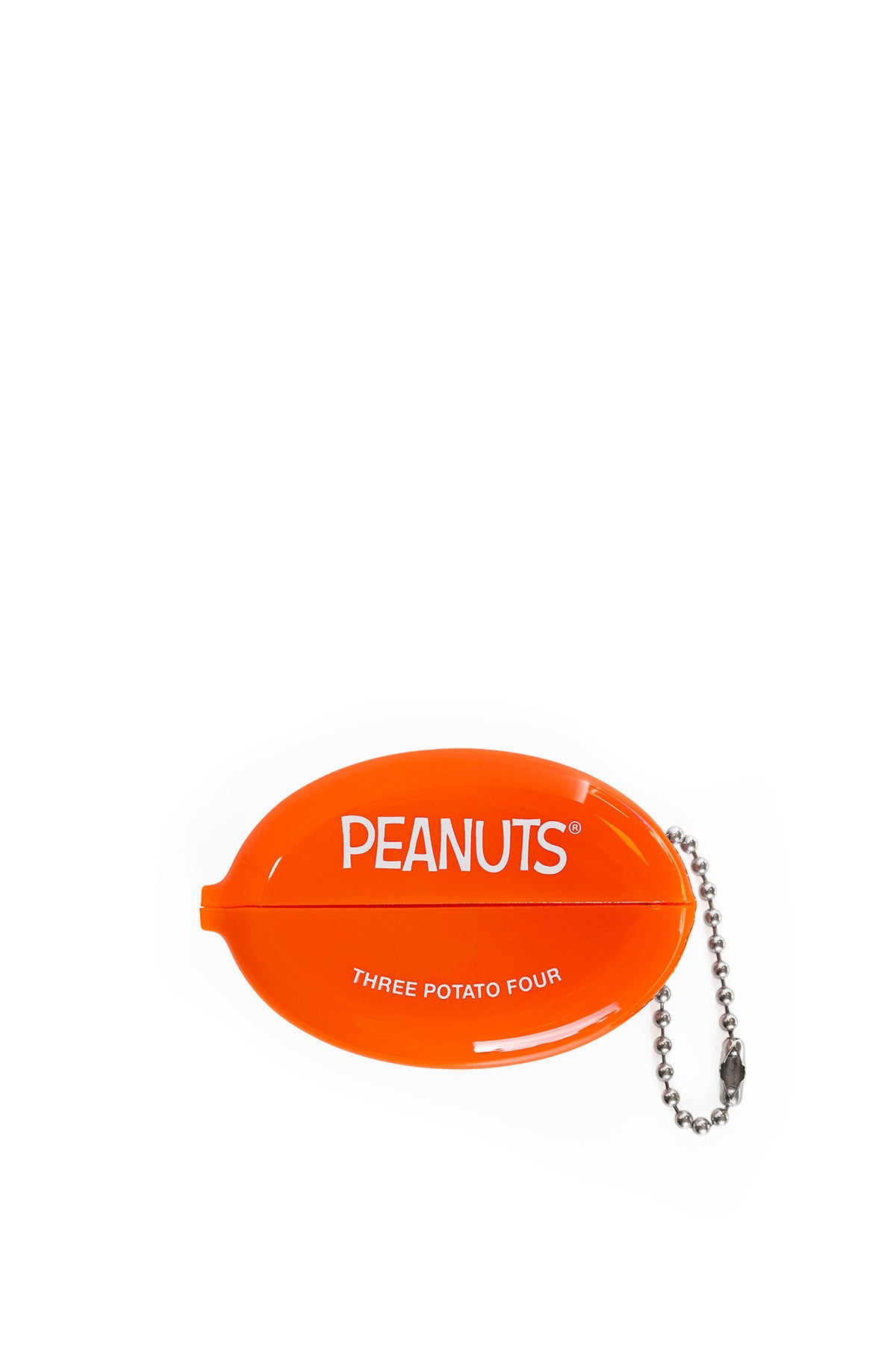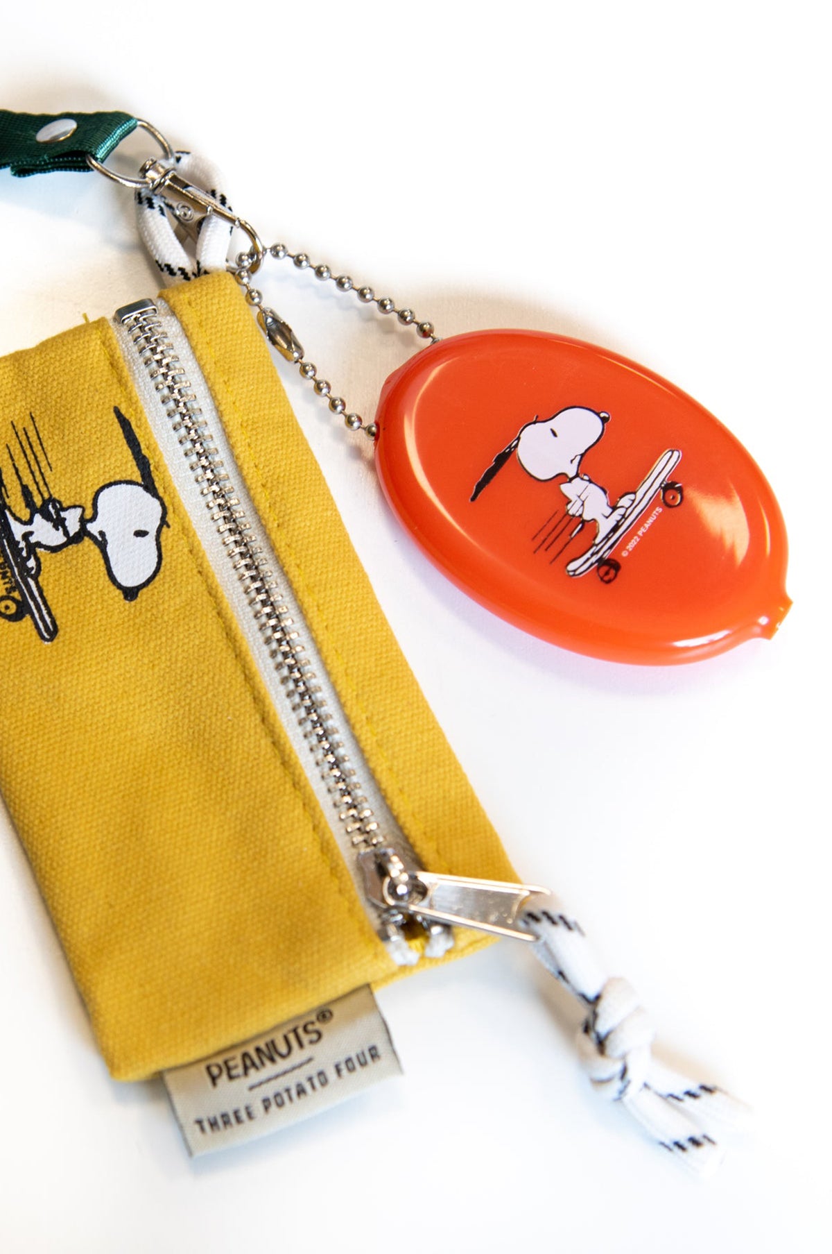 This pouch is from the Three Potato Four x Peanuts collection and is orangey red with an image of Snoopy skateboarding.