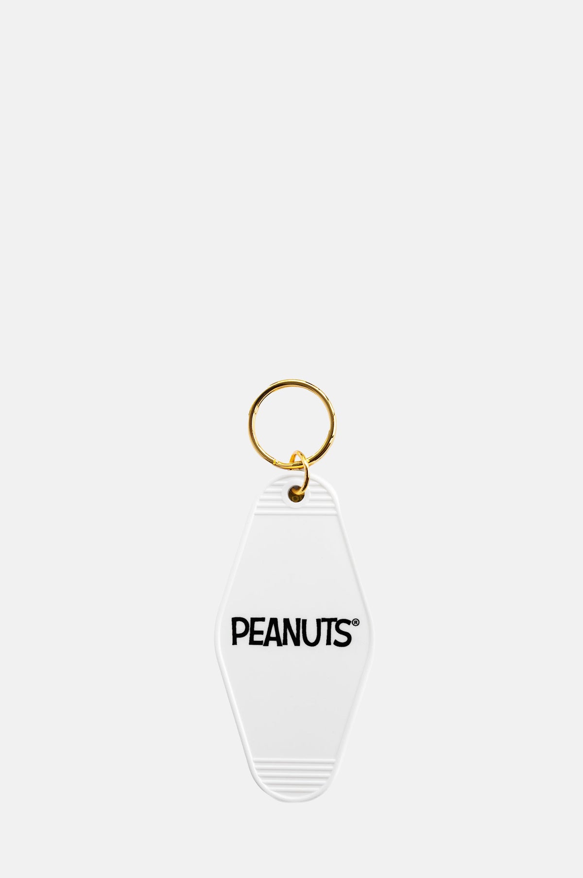 Adapted from classic hotel - motel key tags, this vintage-inspired keychain is adorned with a loving touch of Snoopy nostalgia. This white background design features Snoopy almost as you would expect to find him: lying on his back but on top of a big yellow Smiley!