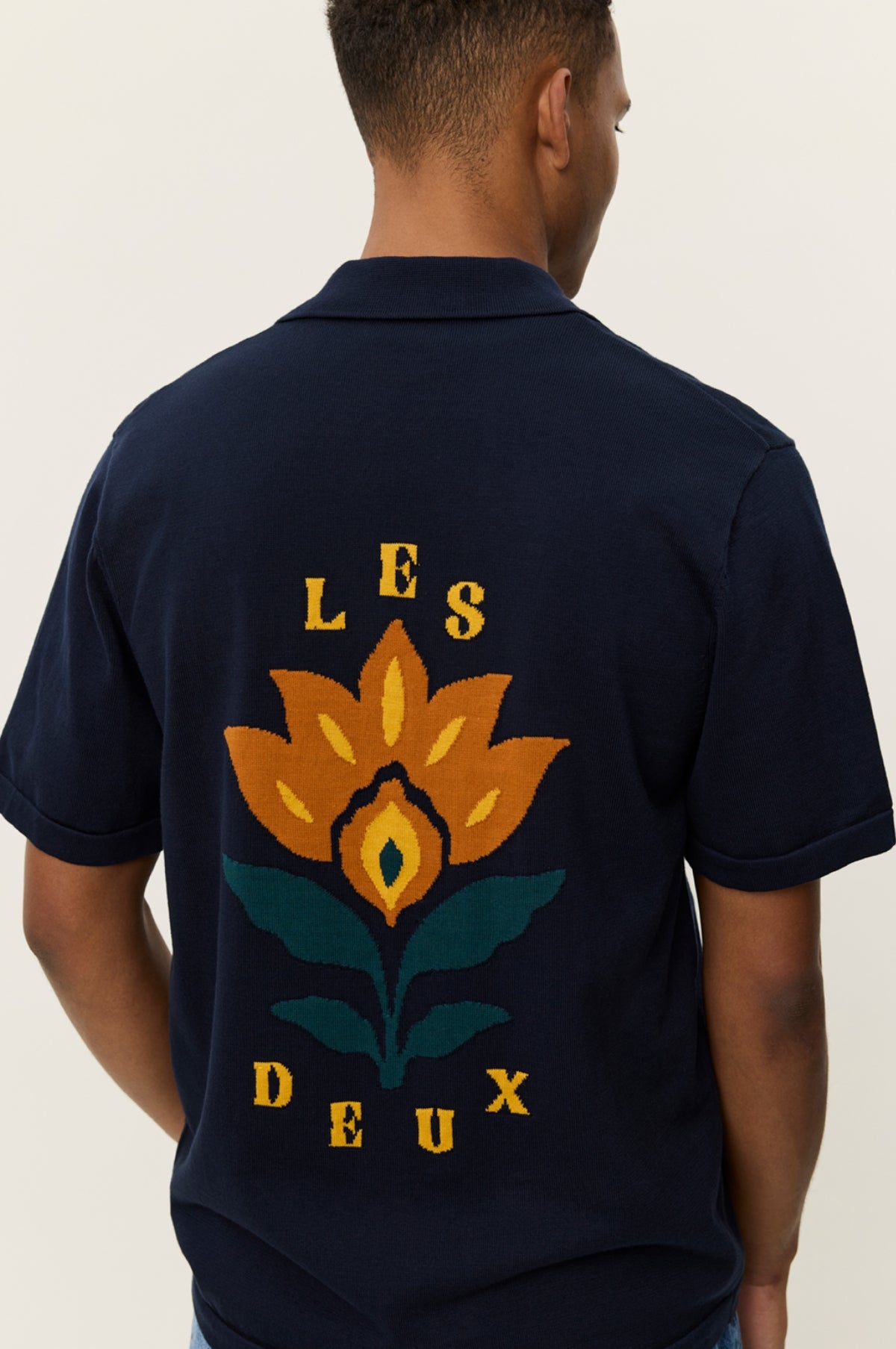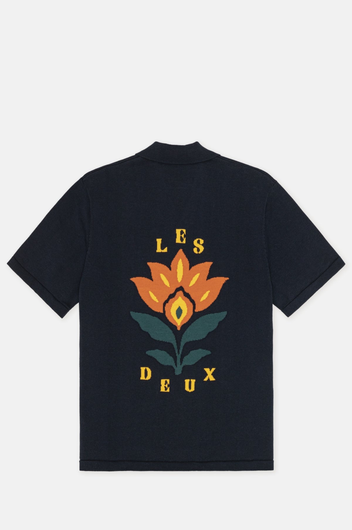 Les Deux are a Copenhagen based brand that bridge the gap between streetwear and classic menswear with a minimal aesthetic and reasonable price point. The Emmett Arabesque Knitted SS Shirt Dark Navy is a soft knitted short sleeve shirt with a relaxed camp collar. The back features a seasonal jacquard artwork that adds a bold graphic expression to the clean front.