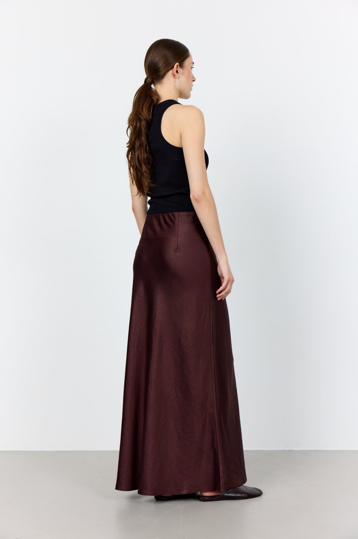 This maroon coloured slip skirt from Levete Room lends itself to elegant dressing. Spun from a smooth material with a subtle woven pattern, this maxi skirt offers generous length, skimming the ankle. Style with a t-shirt or jumper for a classic look.
