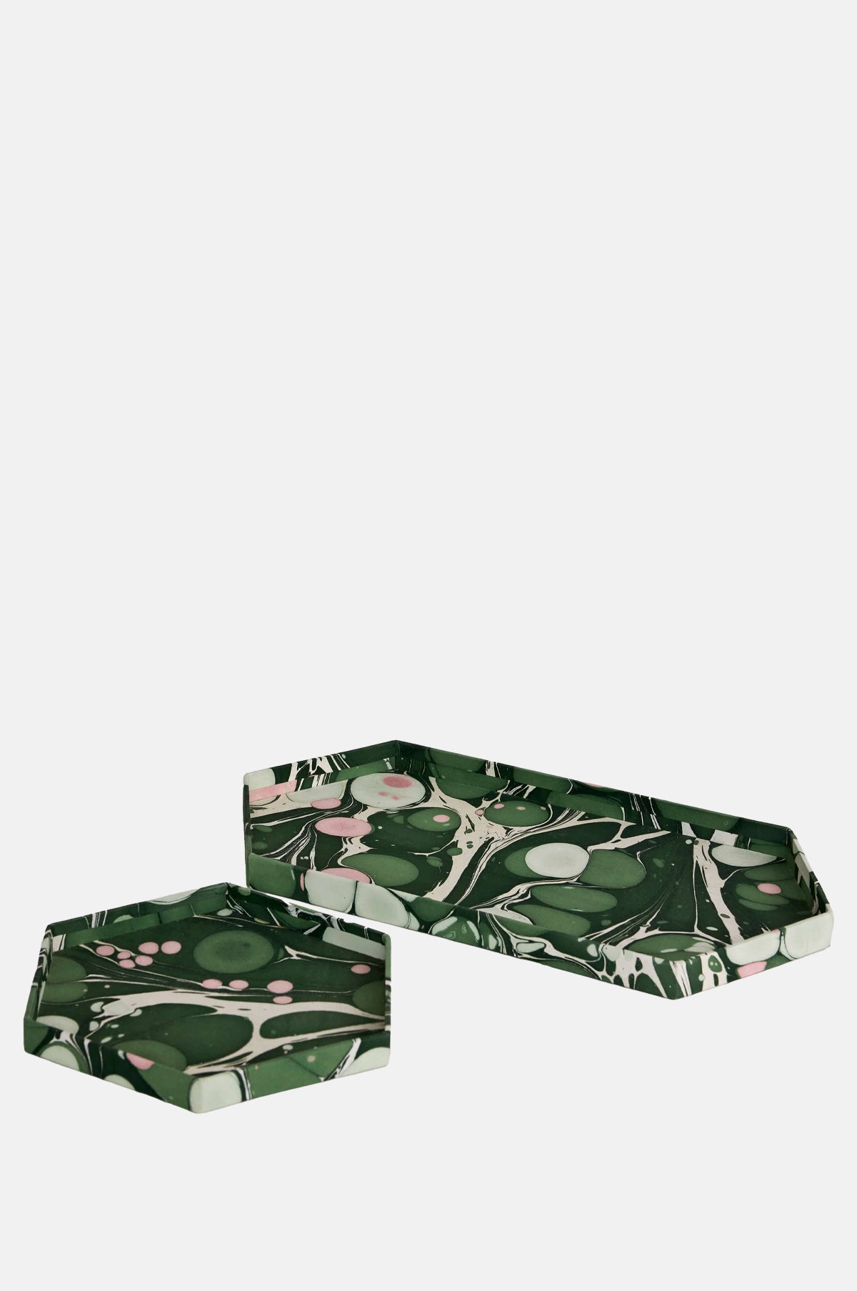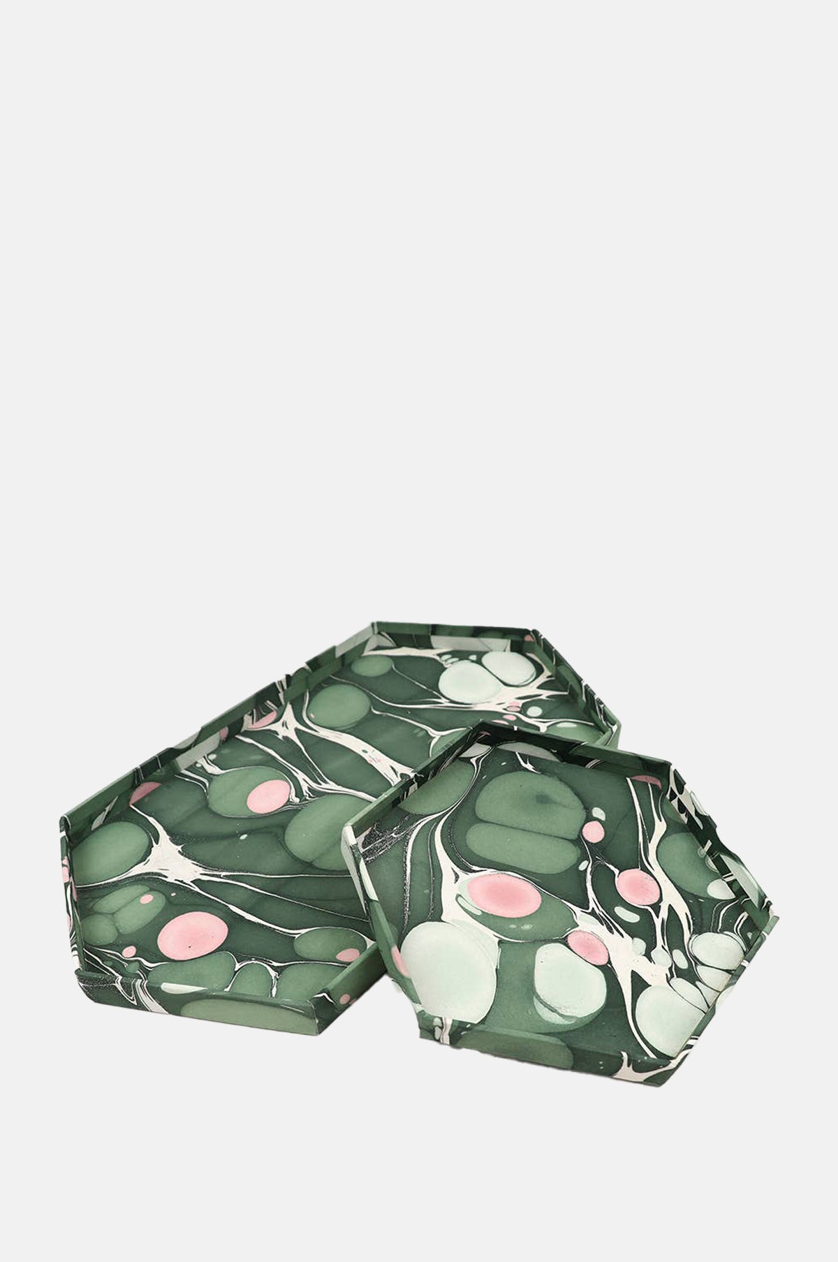 Craft Boat recycled cotton paper trays are handmade by master artisans who have been creating vintage style boxes and cartonage products for generations in Jaipur. This beautiful paper design featuring a green and pink marbled pattern has been hand block printed. This set of two nested trays will add an elegant and practical Victorian touch to your desk spaces, living rooms, or the table next to your front door. Perfect for extra pencils, small notes, keys or little charms.