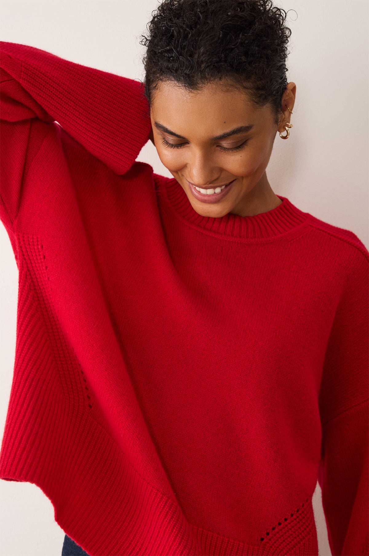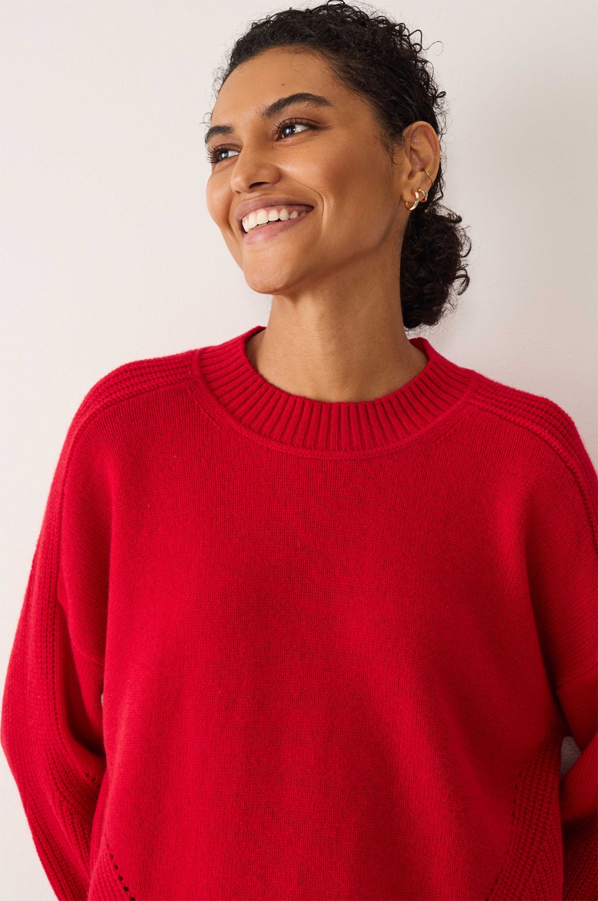 This bright red cashmere jumper provides a joyful burst of colour to any outfit. Crafted from a soft Inner Mongolian cashmere, it is thoughtfully designed with travelling ribs and side panels for a flattering fit. A knit ideal for lightweight layering.