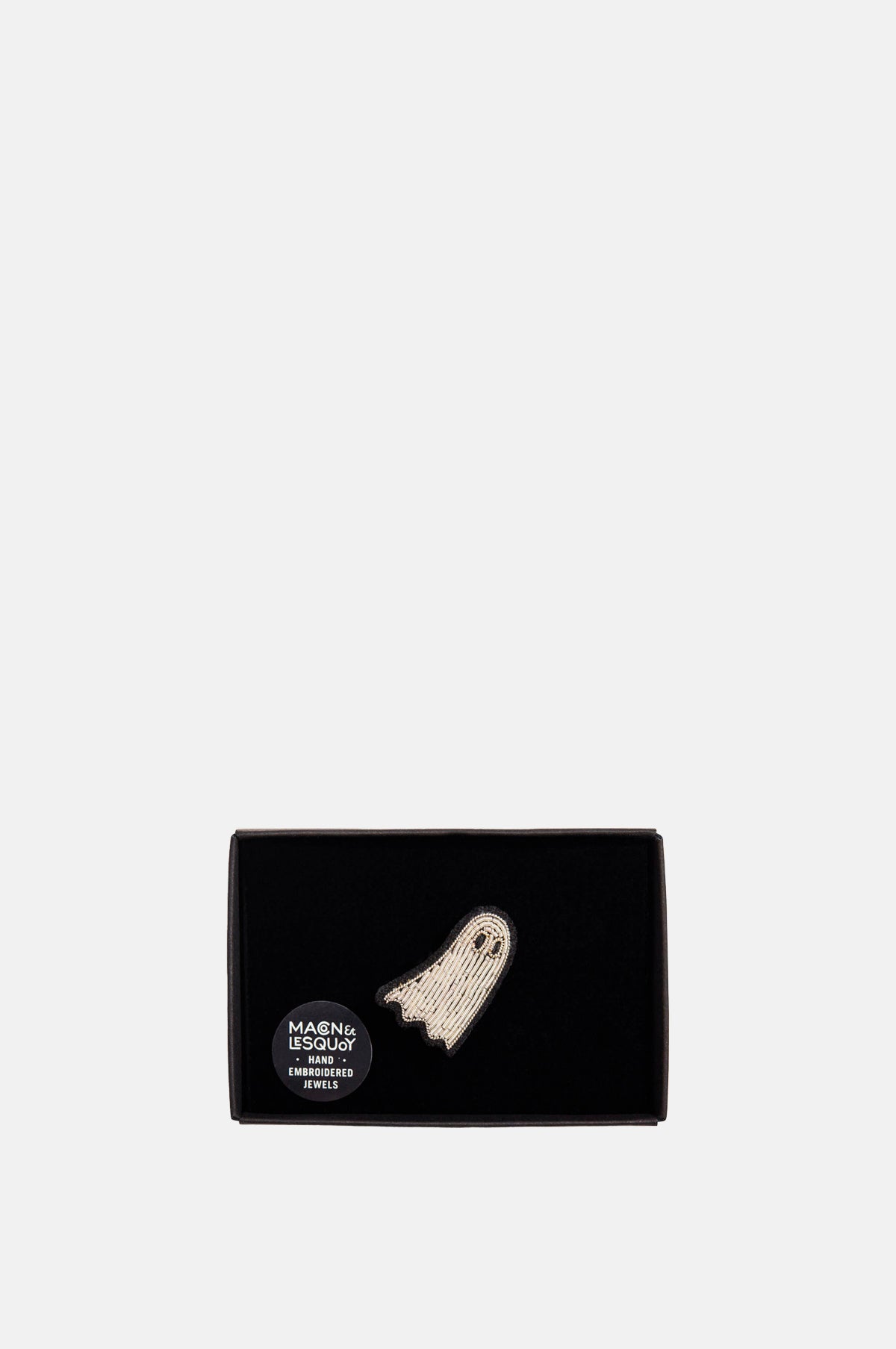 Boo! This adorable ghost brooch is crafted using silver cannetille thread to give him his spooky look. Pin on a jacket lapel or bag for playful accessorising.