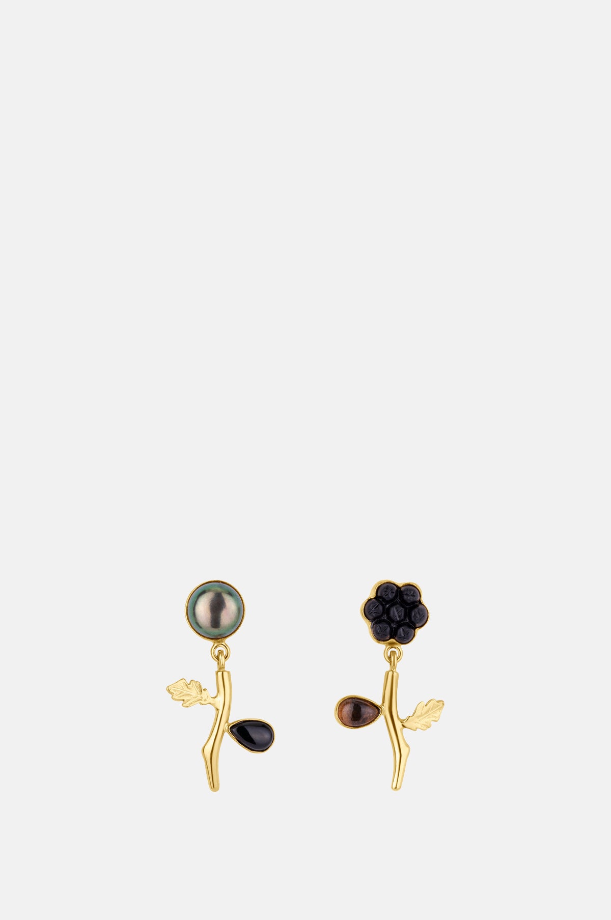 These small mismatched flower drop earrings from Grainne Morton are distinctly art nouveau and consist of two flower shaped drop earrings made from gold-plated silver, jet, onyx, pearl, and smokey quartz. Perfect for adding a bit of mystery and romance to any outfit.