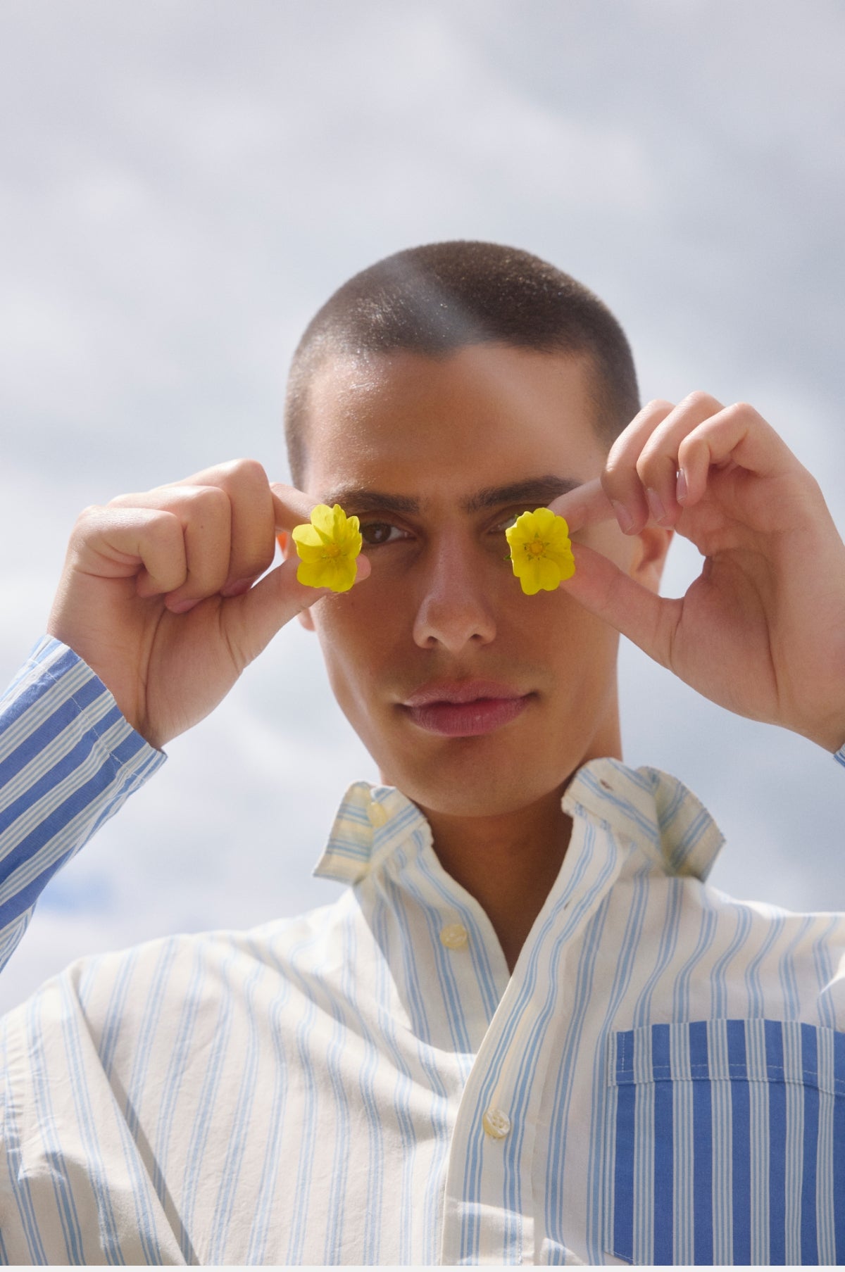 The Foret Camp Patch Shirt in Light Blue is crafted from two striped blue poplin fabrics, creating a striking contrast with its distinctive patchwork design. Blending contemporary detail with classic style, it’s a fresh take on a timeless wardrobe staple.