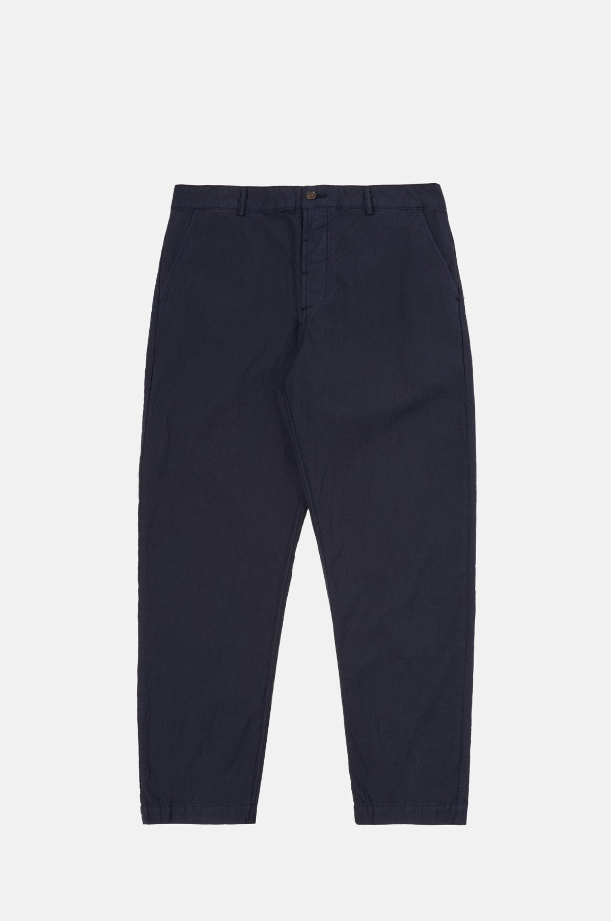 The Military Chino from Universal Works are a modern staple with a comfortable, loose tapered shape that's great for all occasions. This season's offering are cut from lightweight cotton seerscuker with a mid-rise, slant hand pockets on the side and button-secured rear pockets. Pair with the matching Five Pocket Jacket for the full suit.