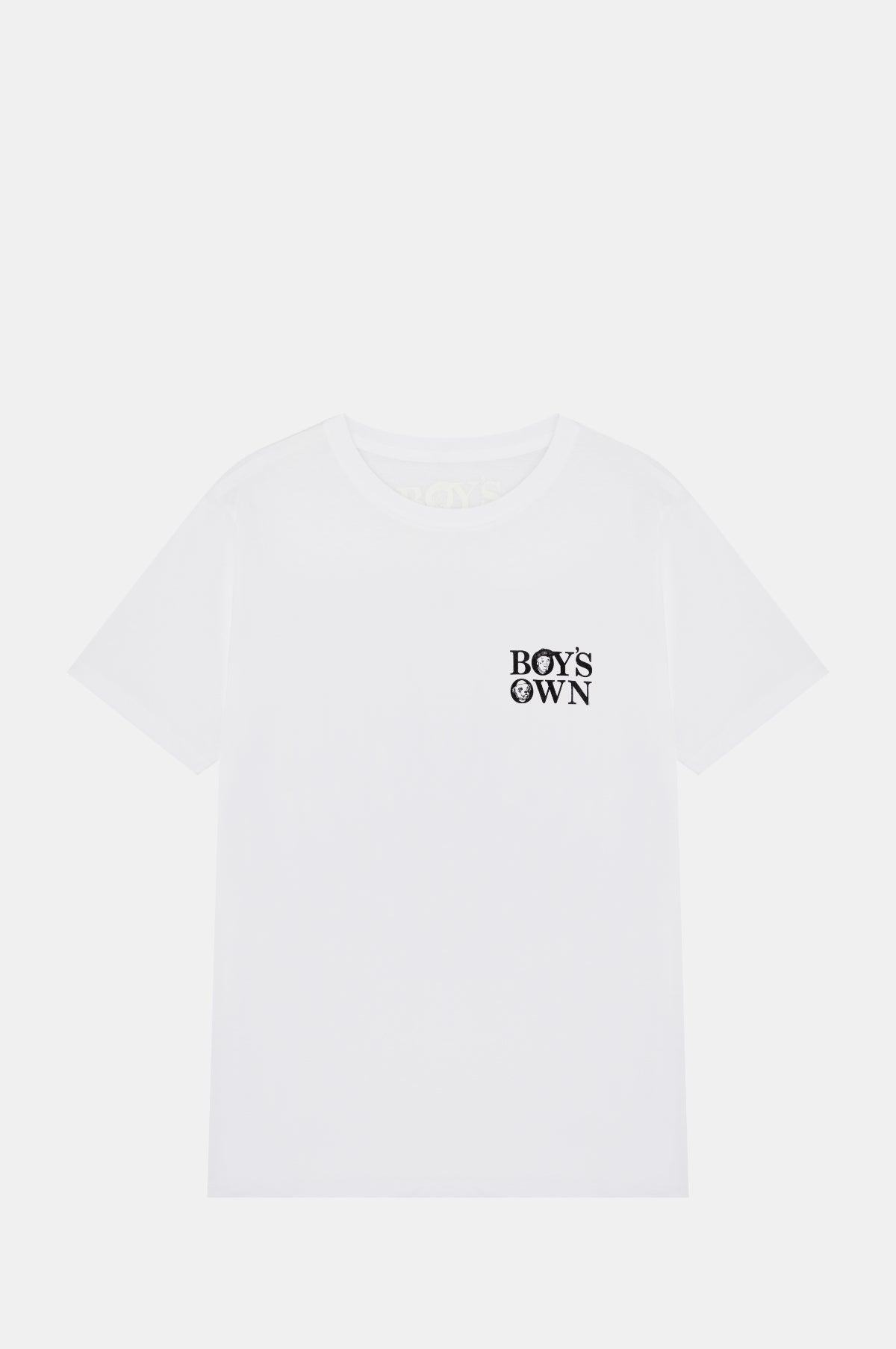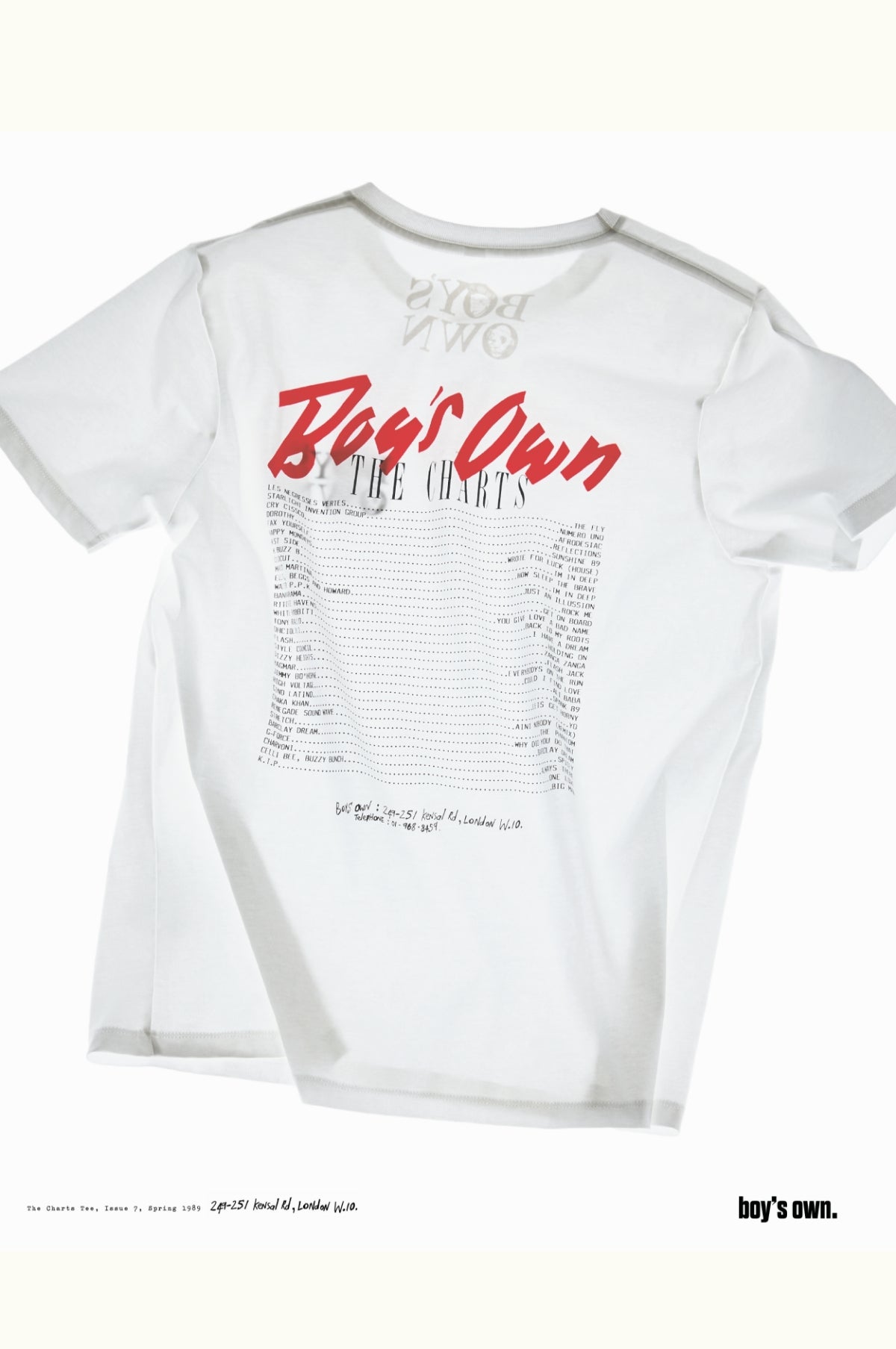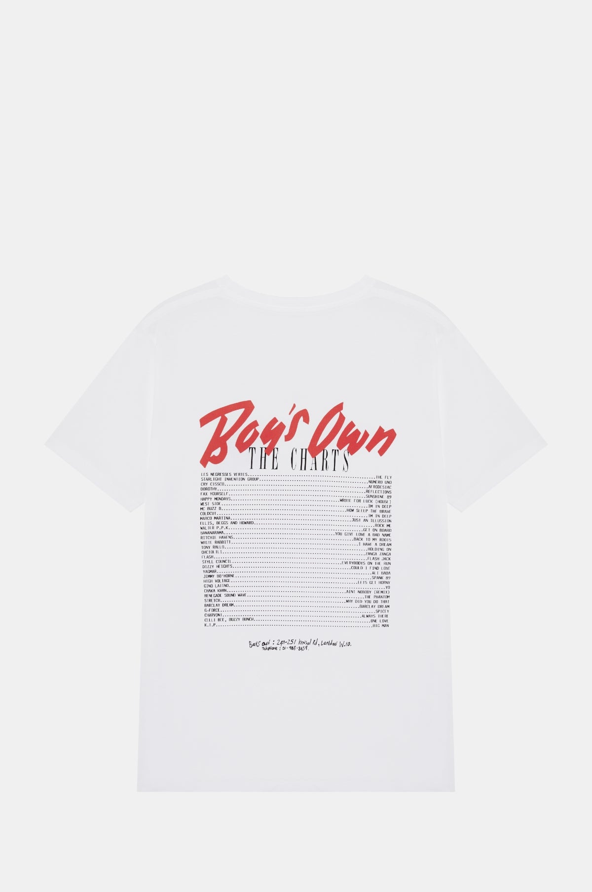 The Charts Tee in White from Boy's Own features a large back graphic with a charts list of all the Boy's Own classics, perfect for those looking for a piece of history.