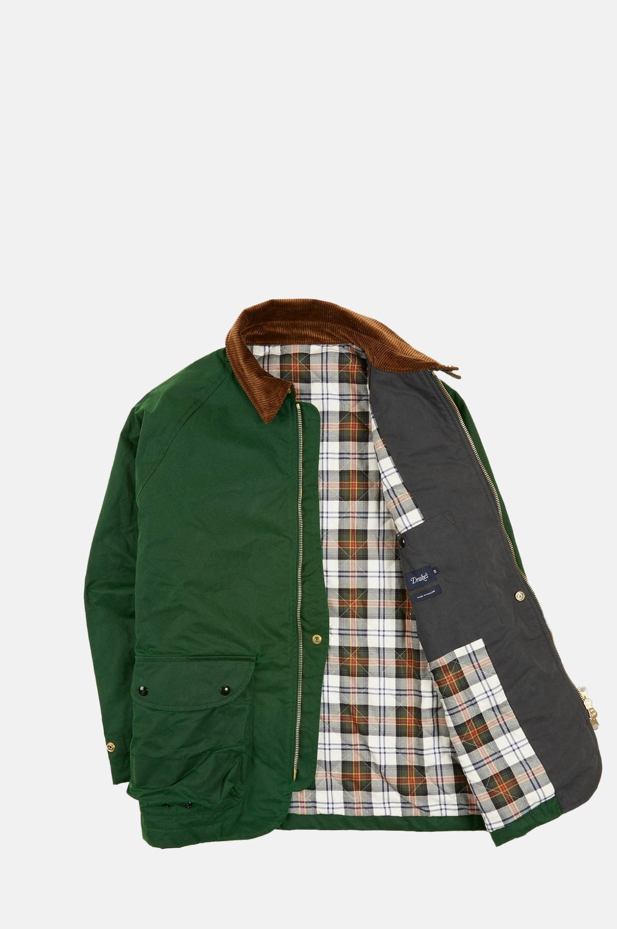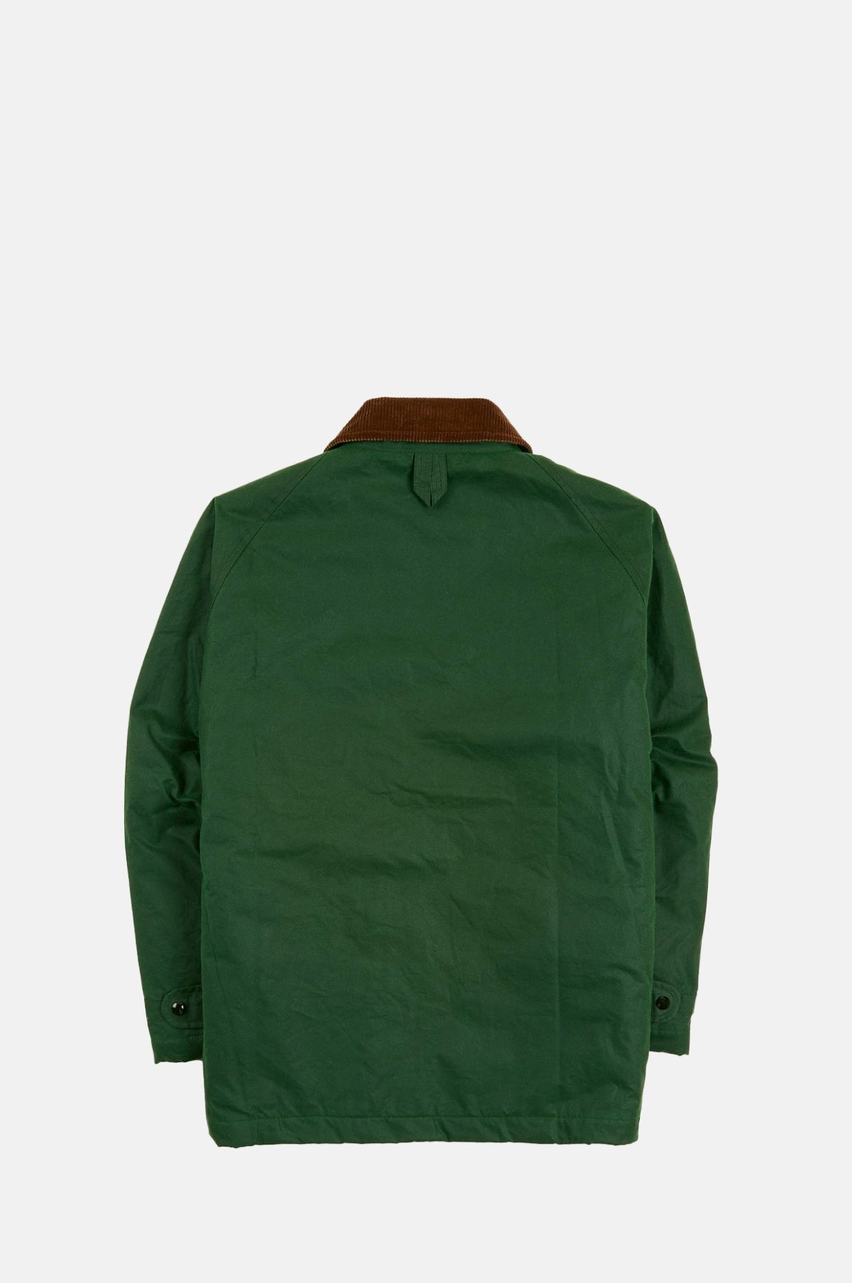 The Emerald Green Waxed Coverall Jacket is a generously sized piece of outerwear synonymous with the protean British weather.