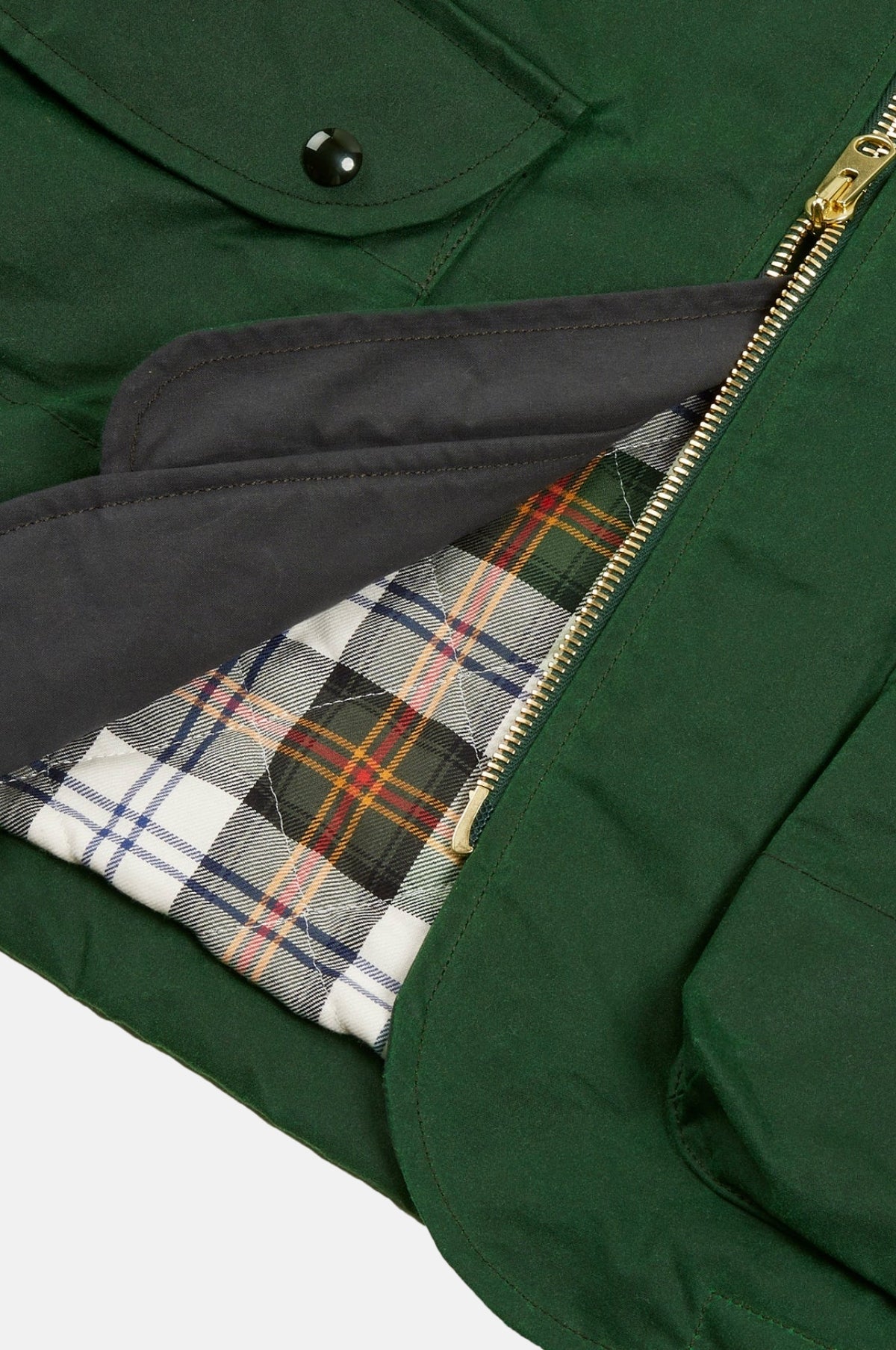 A hearty waxed cotton composition in a traditional emerald green offers unrivalled patination that will only improve with wear, while patch and stud bellows pockets provide ample utility whether strolling in town or stalking in the country.
