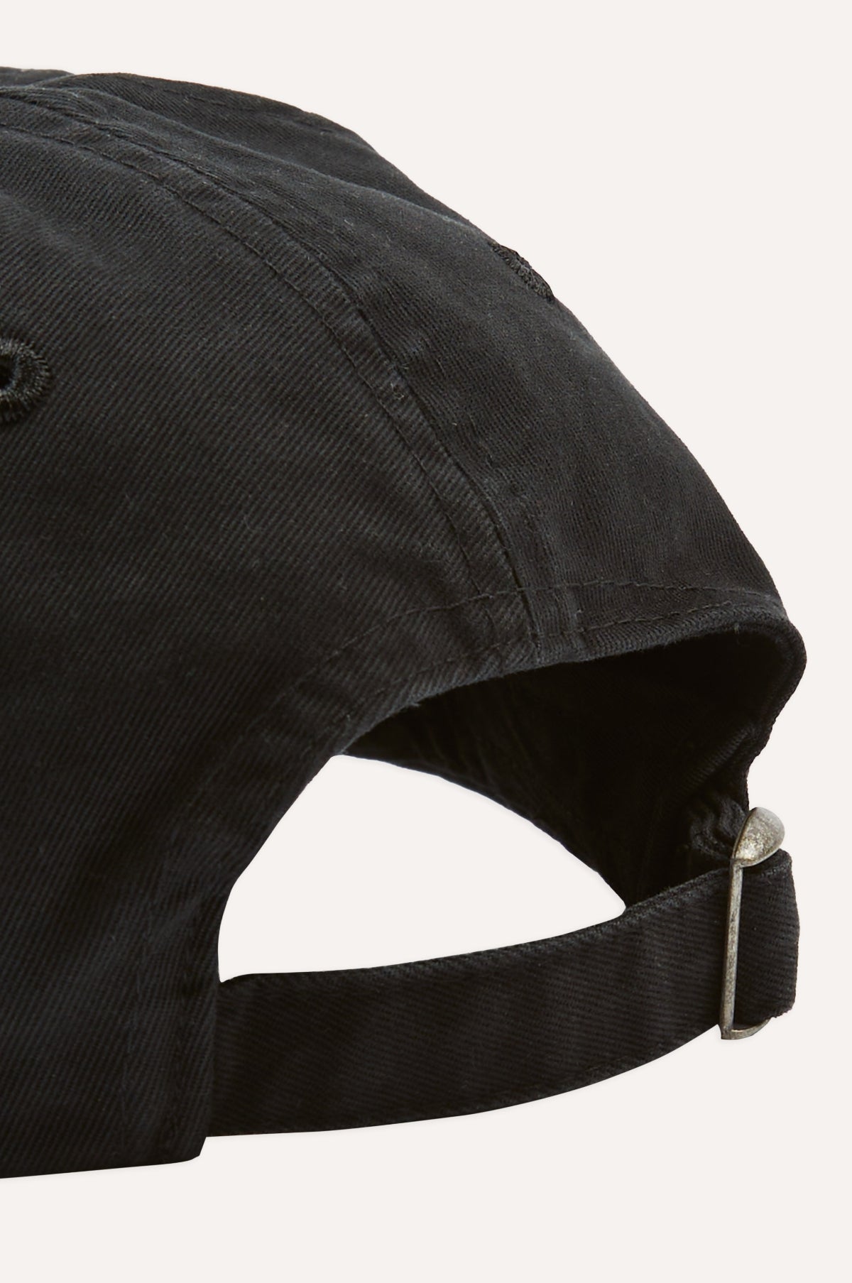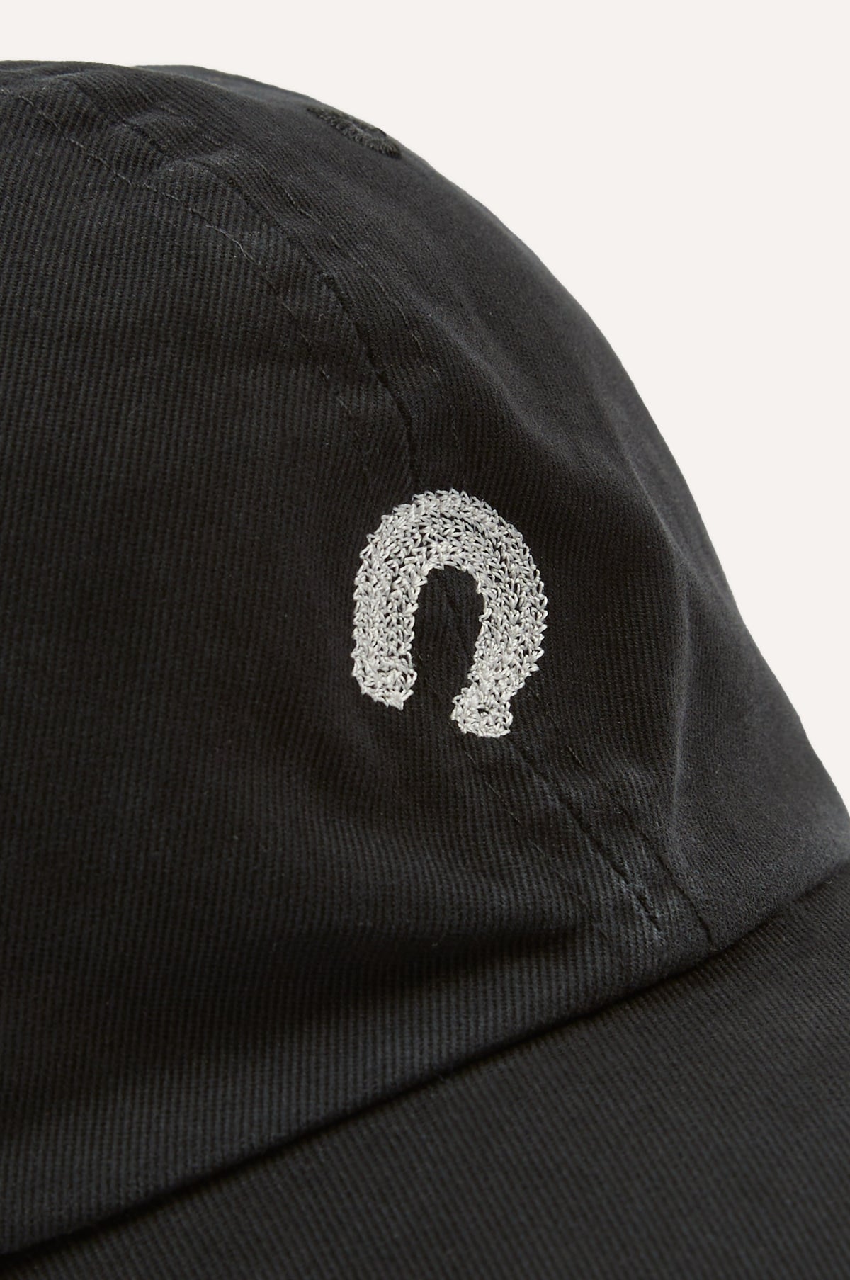 The Horseshoe Chainstitch Baseball Cap in Black is crafted from cotton, ensuring it gains more character with every wear. With its relaxed silhouette, soft crown, and gently curved peak, it evokes a nostalgic feel reminiscent of classic athletic wear from earlier times.