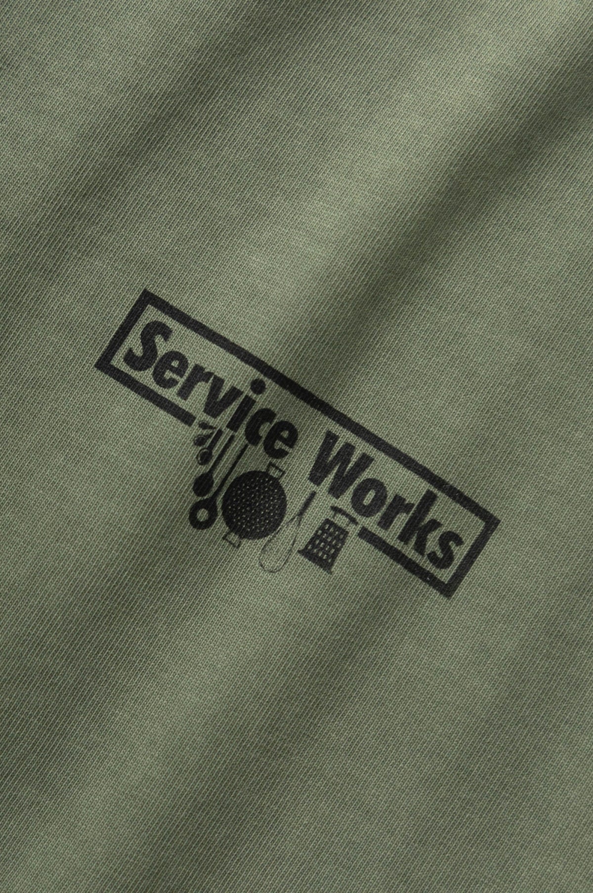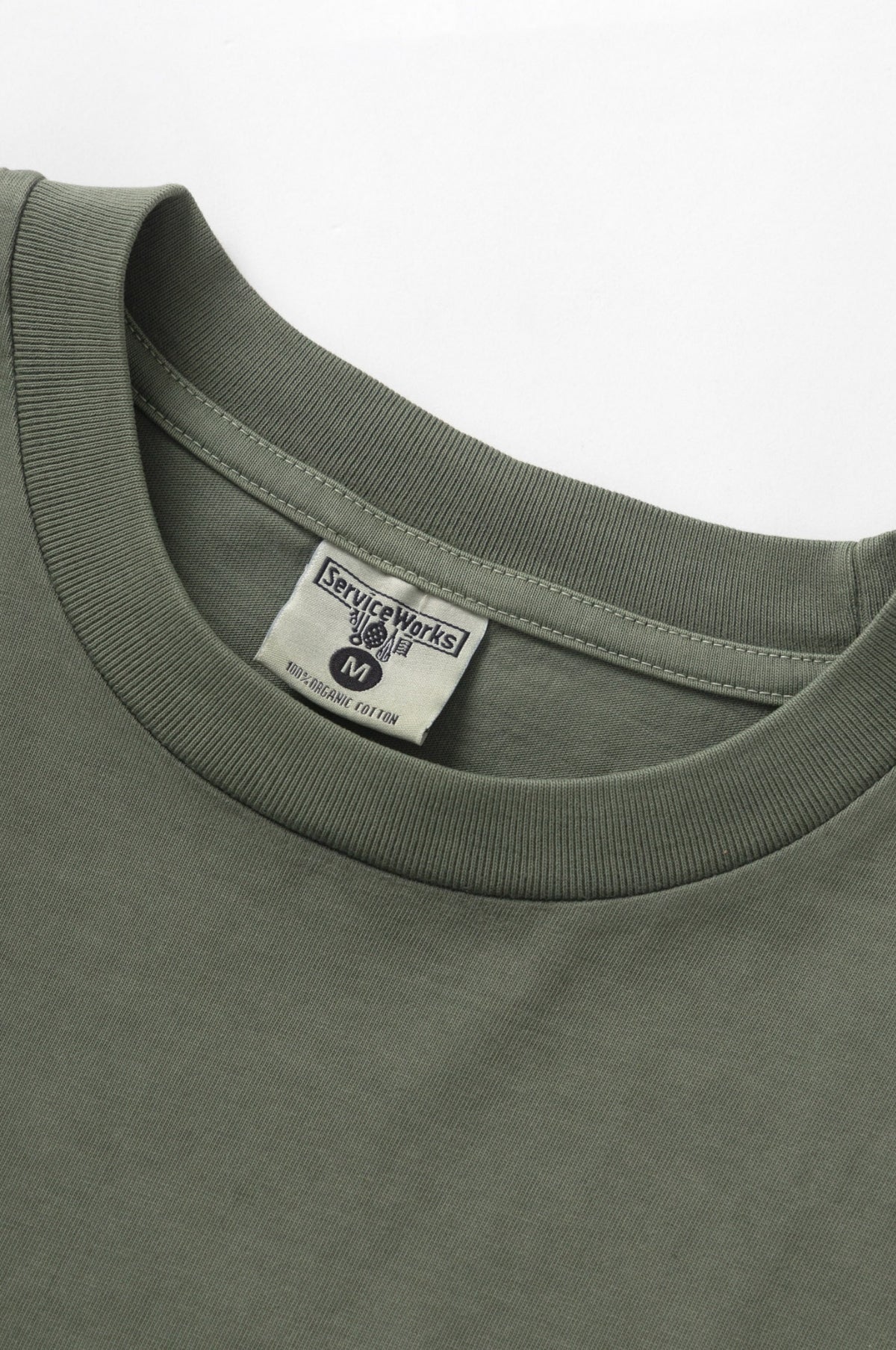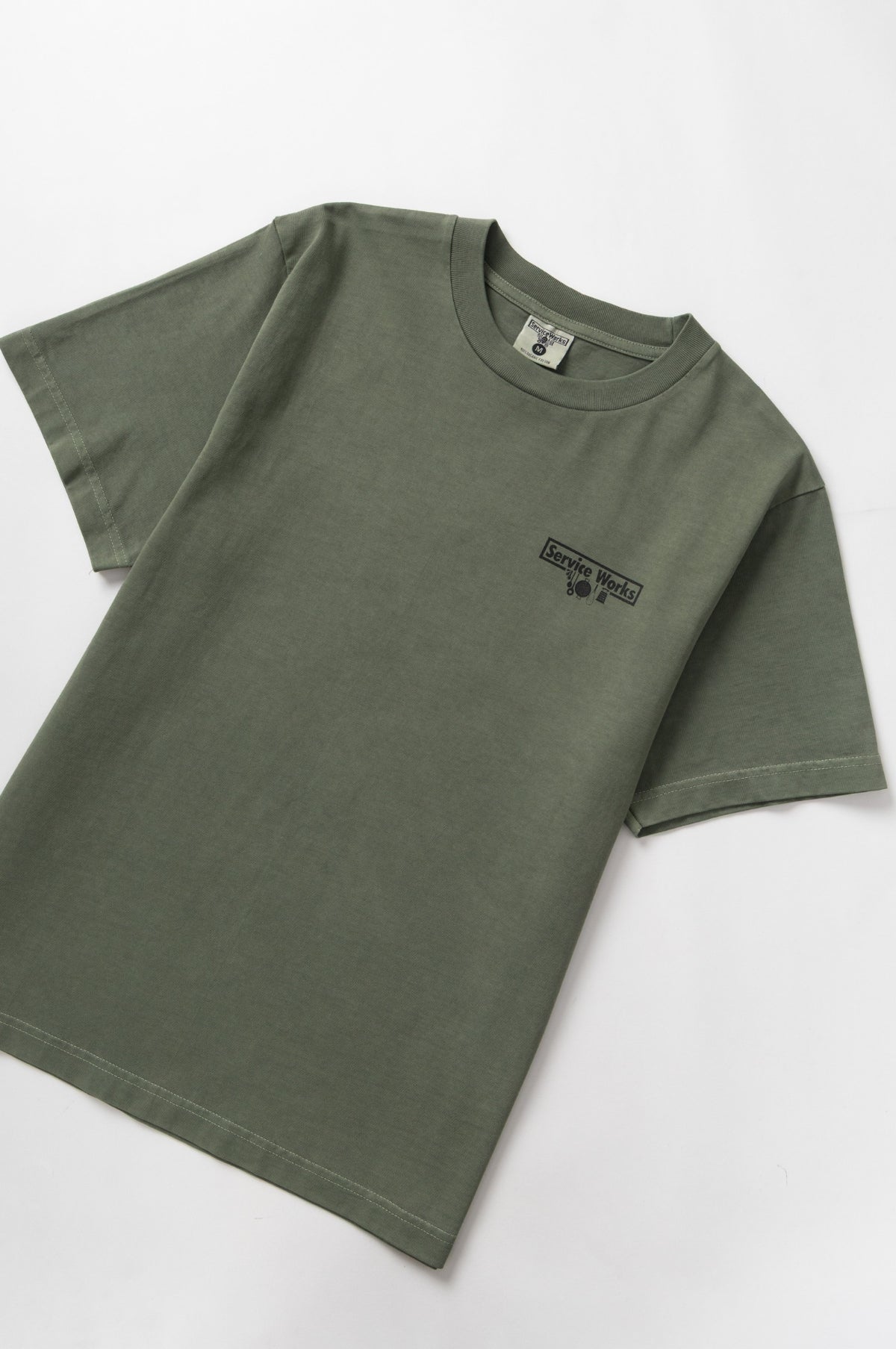 Designed for Chefs, adapted for all. Service Works offer functional clothing that originally started as uniforms for restaurants in London but now serves as the ideal everyday wear. The Pigment Dyed Trademark Tee in Olive is a classic logo tee with a small chest print and features an worn in washed feel.