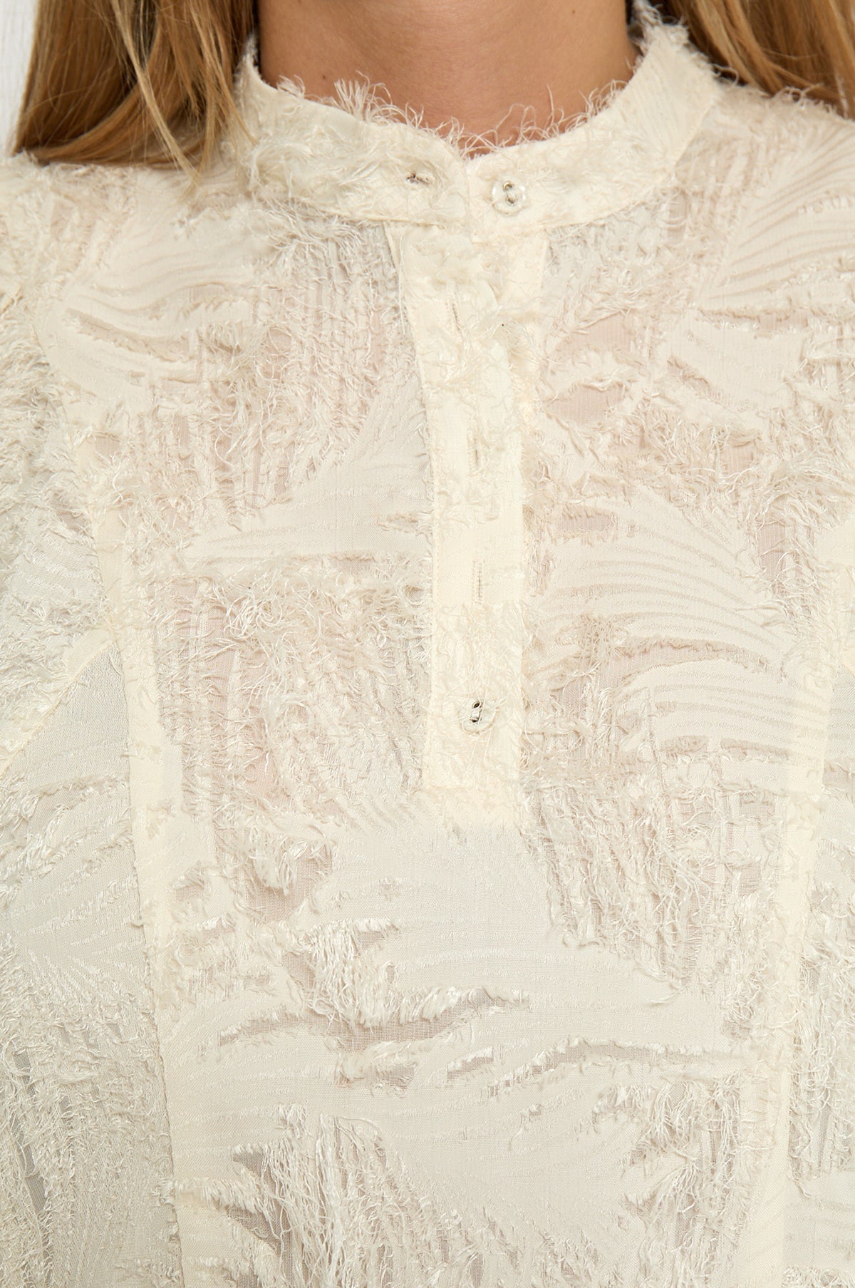 Elevate your wardrobe with the Hollie blouse from Minus. With a frayed fabric design, this pretty cream blouse has a wonderful shape thanks to darts added during its construction. Woven from a beautifully lightweight fabric, a high neck and line of buttons running down the front complete the blouse. Pair with denim for a more casual look or compliment with tailoring for more formal occasions.