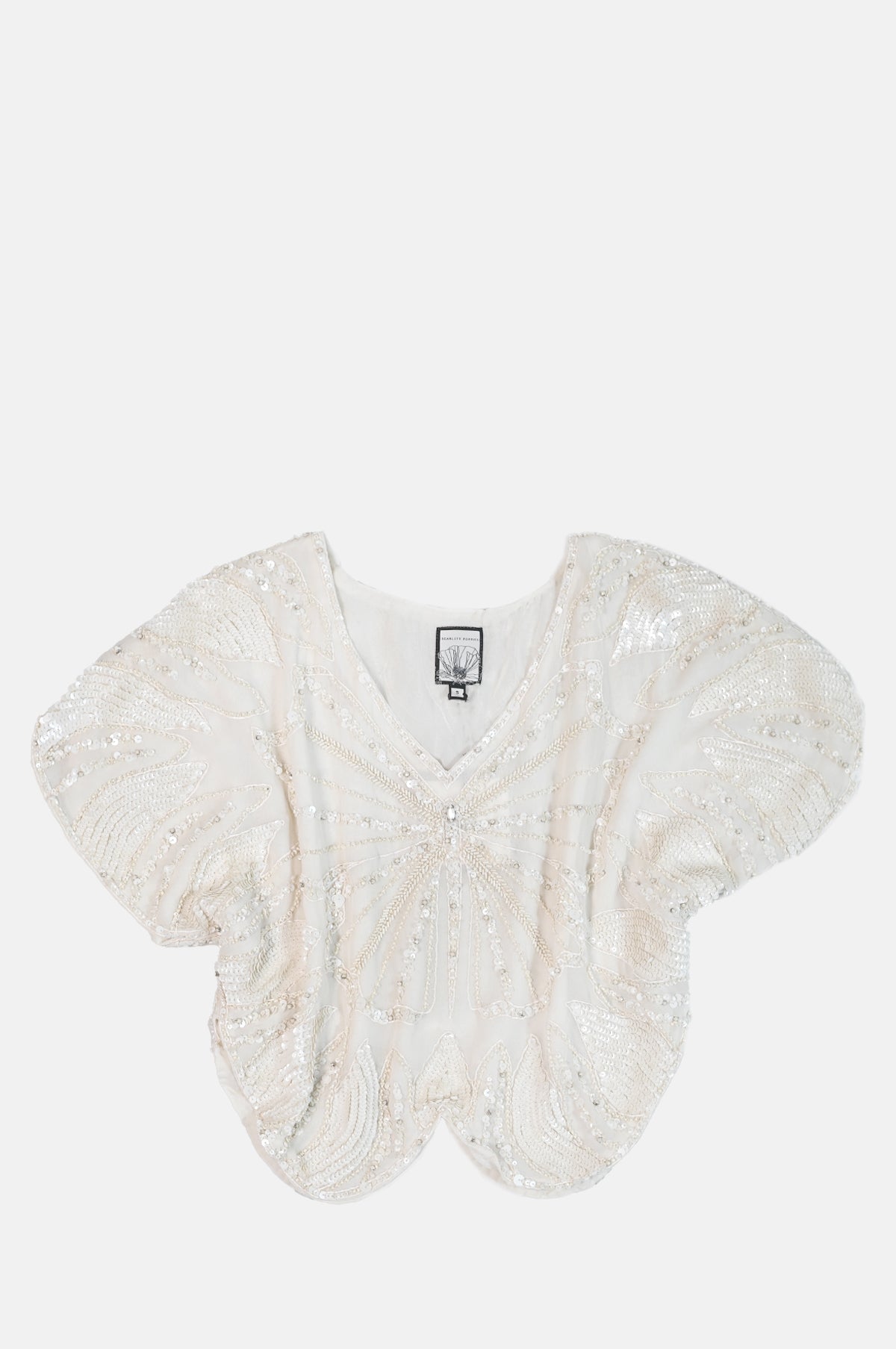 Evoking ethereal, feminine charm, the Chloe Top in Vanilla is as pretty and it is playful. Inspired by butterflies, it is adorned with delicate lines of beaded embroidery to form the pattern of a butterfly's wings. Designed to be loose fitting and full of movement, the top features short sleeves, a deep V-neck and scalloped edges at the hem.