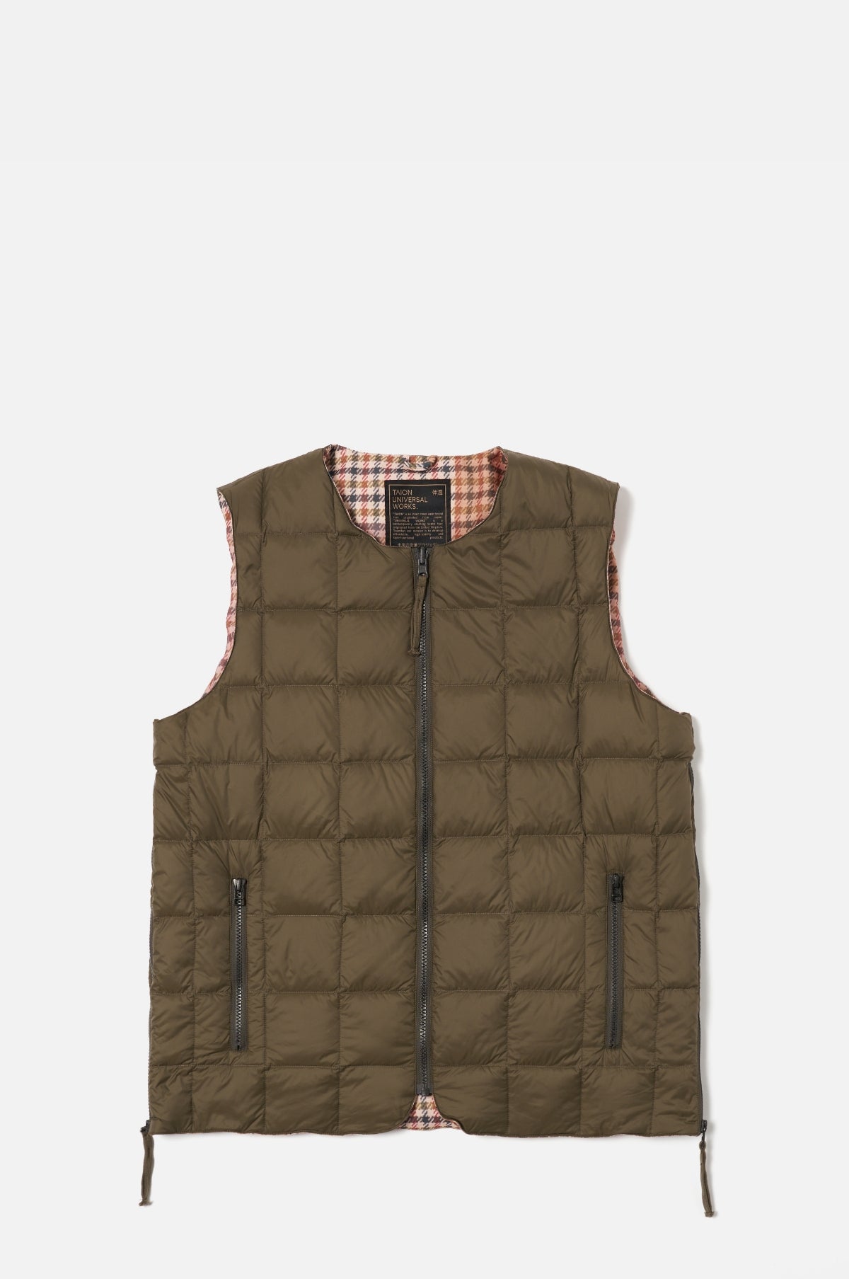 This is a versatile, lightweight down vest designed for easy layering and year-round style. It features a modern, quilted military aesthetic on one side (Dark Olive) and is fully reversible to a unique heritage plaid pattern on the other. With secure zip pockets and a full-zip front, it provides adaptable core warmth and two distinct looks in one piece.