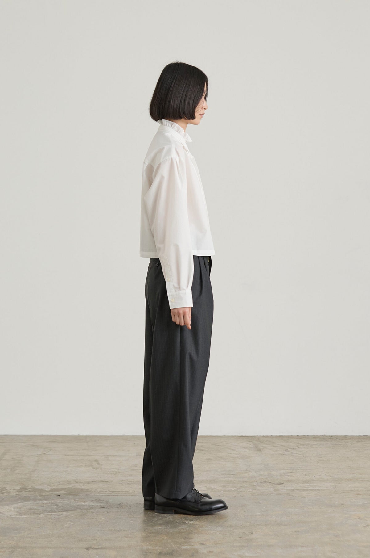 A fresh take on traditional men's wear tailoring, this long-sleeved white blouse from Nicholson & Nicholson has been given a feminine twist with its ruffled collar and sweet tie detail. It has a cropped fit just above the hips - allowing it to sit seamlessly over skirts and trousers.