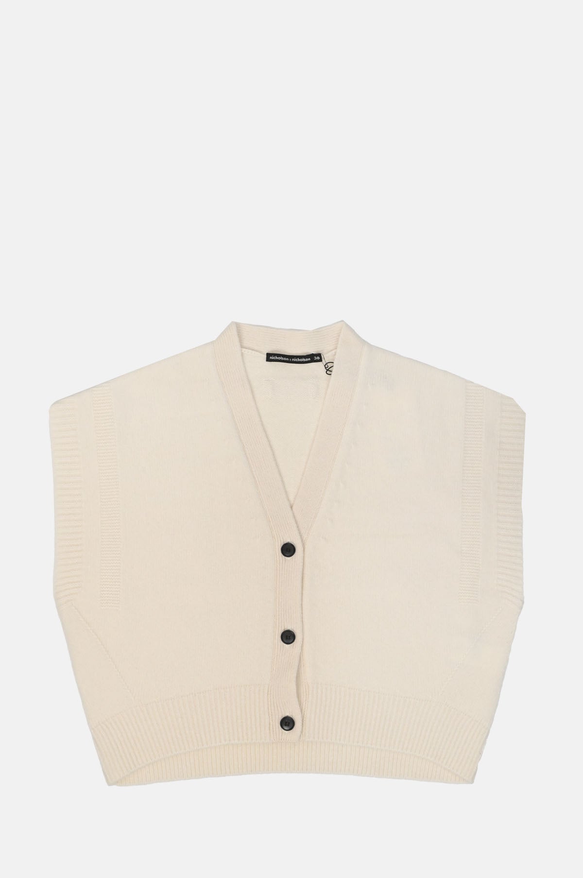 Nicholson and Nicholson is a Japanese brand that was founded in 2007. Initially a menswear line, they have since transitioned to womenswear with a nod to menswear tailoring. The brand's references to traditional suiting can be seen in this knitted vest top: with a deep V-neck, a button up front, and just the hint of a batwing sleeve it is a contemporary and feminine take on the sweater vest. A soft, medium weight knit with a slightly cropped front it has a cool, relaxed fit. We will be going full academia and styling these with a slim roll neck top, wide leg trousers, knit socks, and loafers.