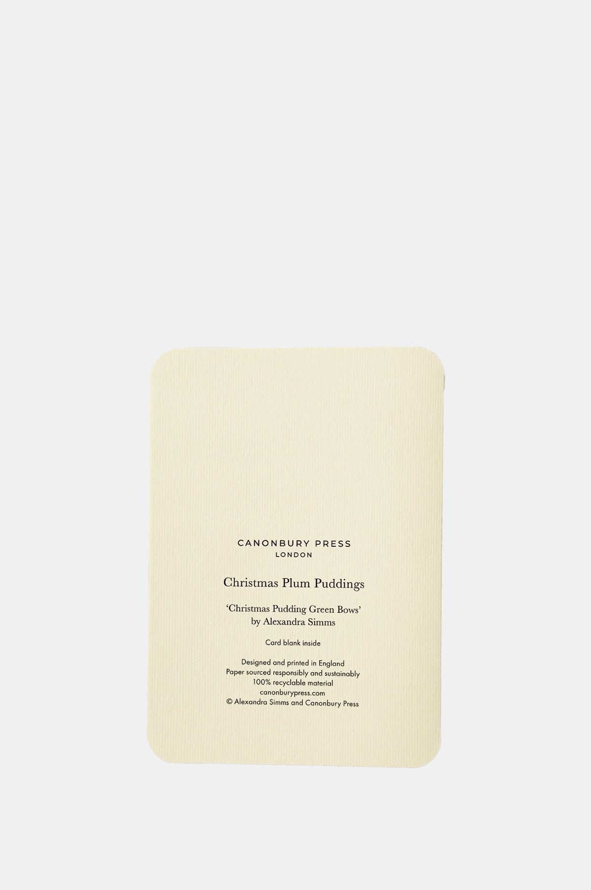 Inspired by decorative Victorian plum puddings, this festive card features a Christmas pudding richly adorned with three green velvet bows and seasonal greenery. Photographed by Alexandra Simms and printed in England, this is a nostalgic and joyful choice for seasonal greetings or to accompany a thoughtfully wrapped gift.