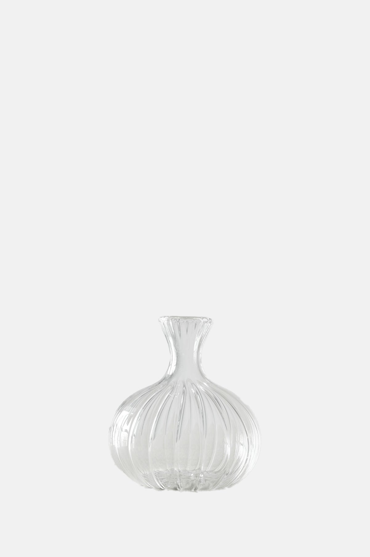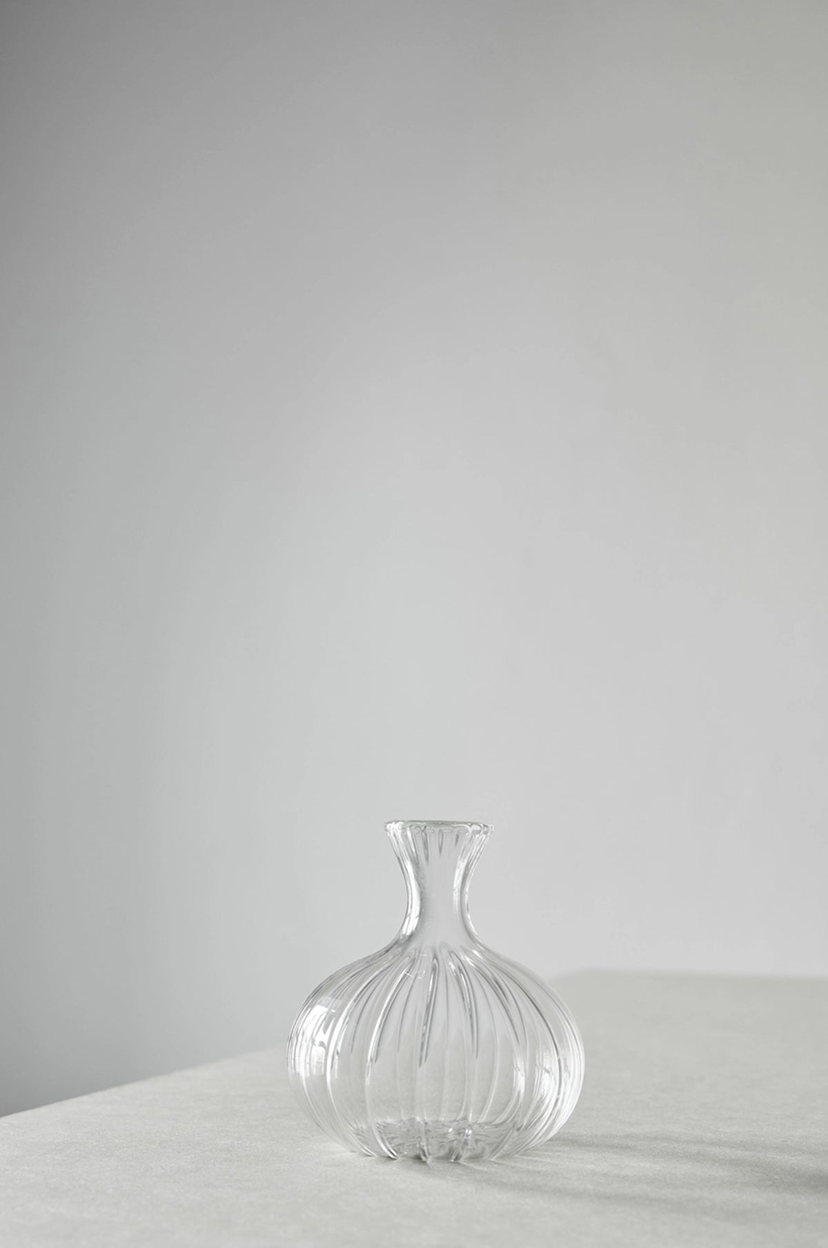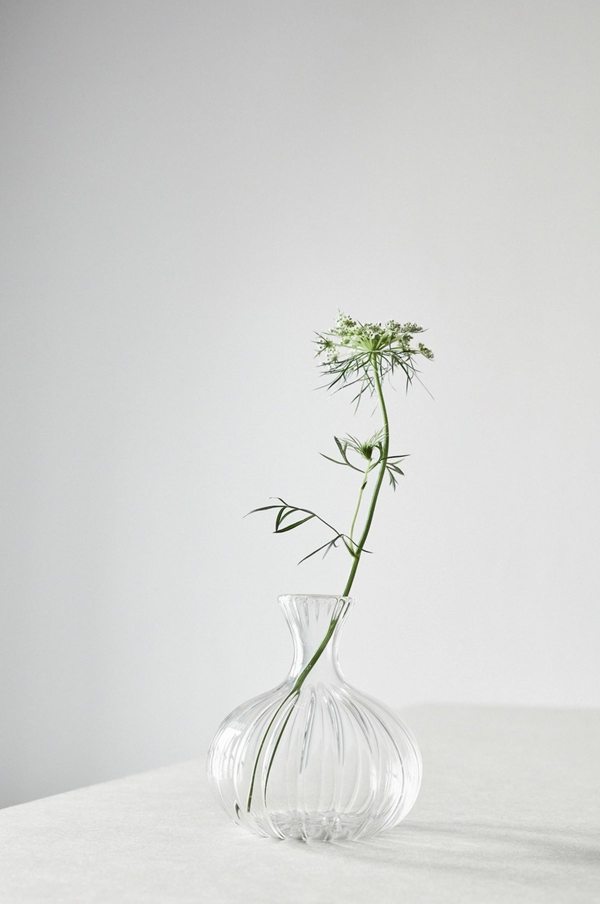 Perfectly proportioned for small cut flowers, this glass bud vase has a classic shape with an elegant long neck. Featuring a joyful ripple design, it is ideal for dotting down a table or as a stand alone piece to make a single stem sing.