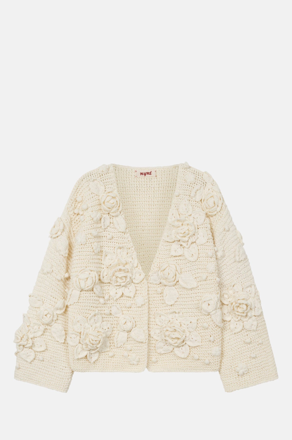 Ever so pretty, this cream cardigan is full of romantic charm and exquisite detail. Entirely handmade, it is dotted with crochet flowers which feature on the body and the arms. Cropped and oversized, this chunky cardigan will be a standout piece in your wardrobe.