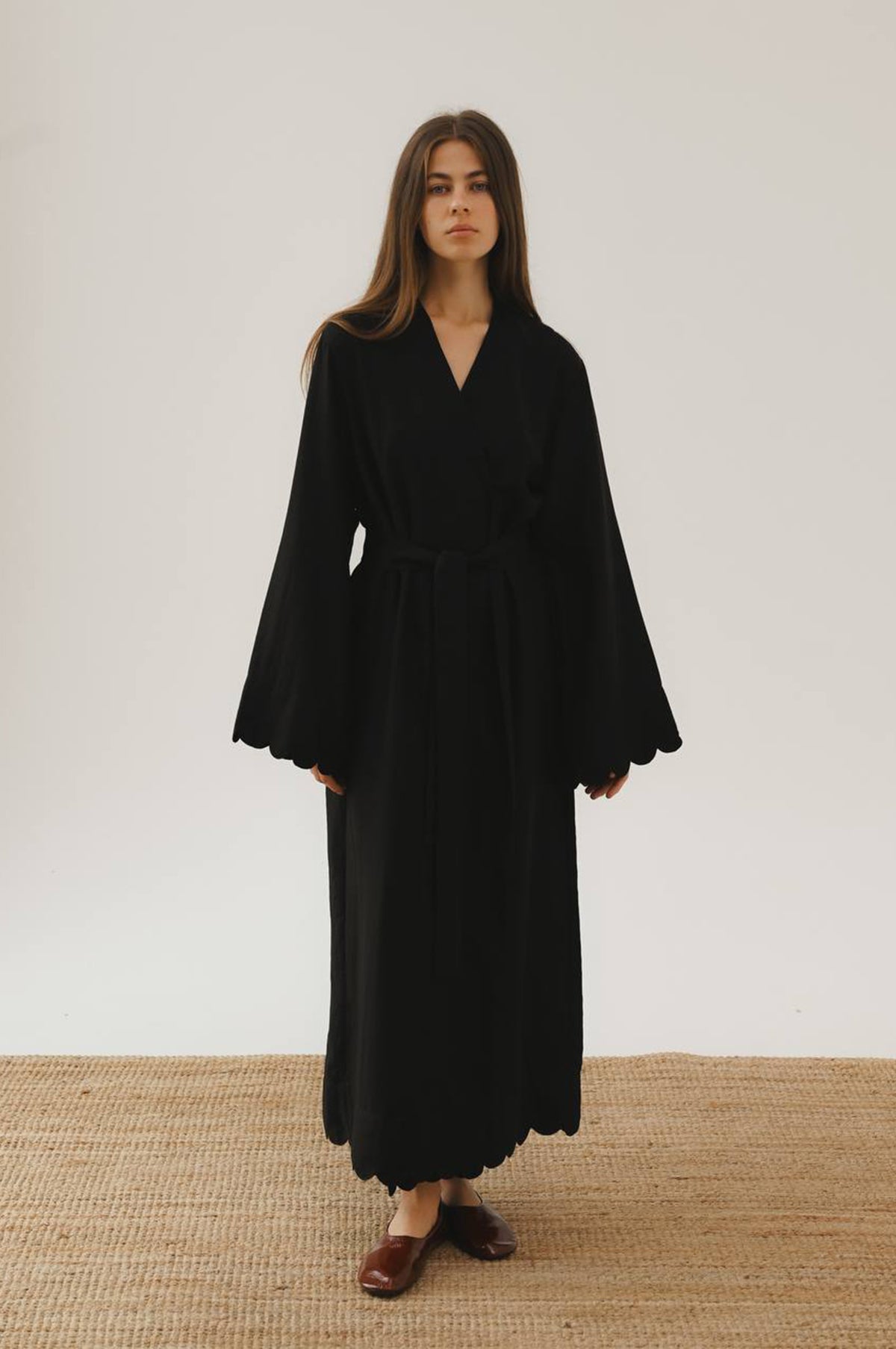 Made from a breathable linen blend, this black kimono from Nyni is a luxurious layer for cooler days and perfect for transitional dressing. Scallop detailing on the cuffs and hem add an elegant touch and make it versatile enough for lounging in or to layer up with as part of your outdoor wear.