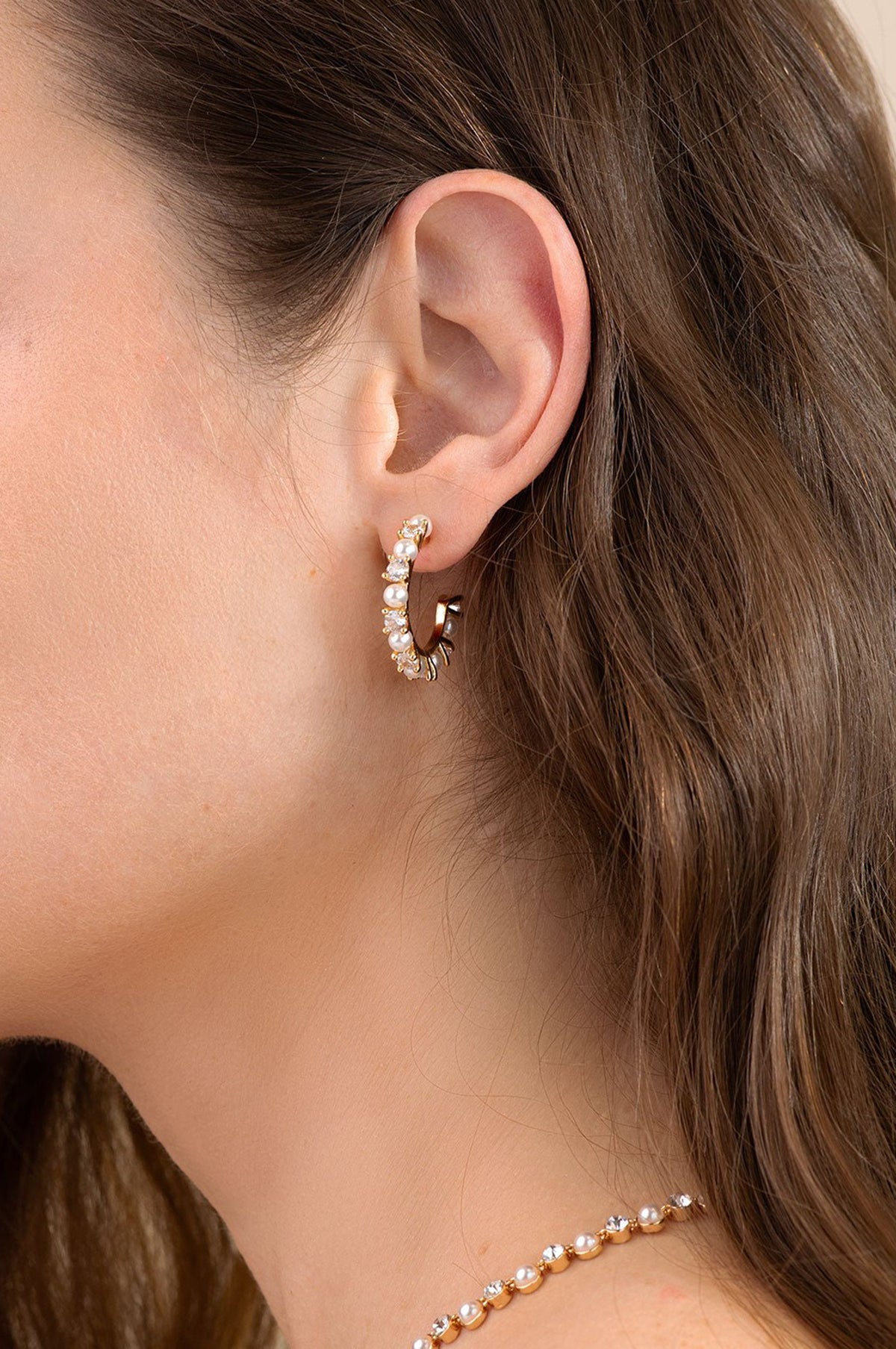 The Prive hoops are confident, fresh and oh-so chic. Featuring large, alternating prong-set gems and luminous pearls on a 14K gold plated hoop. Adding a joyful sparkle to daily dressing.