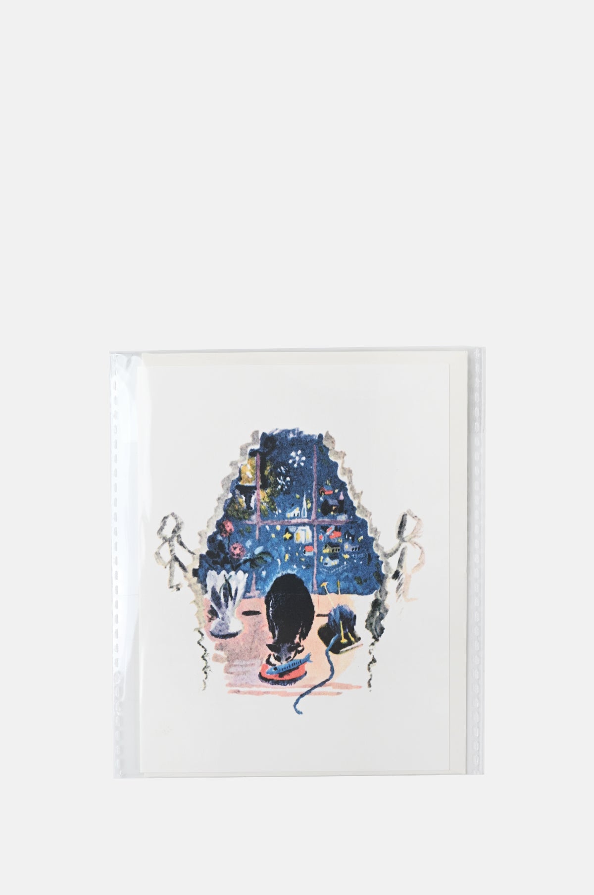 Reimagined from a vintage Children's book this holiday card from Parcel Paper Goods features a sweet print of a cat enjoying a snack by some knitting.