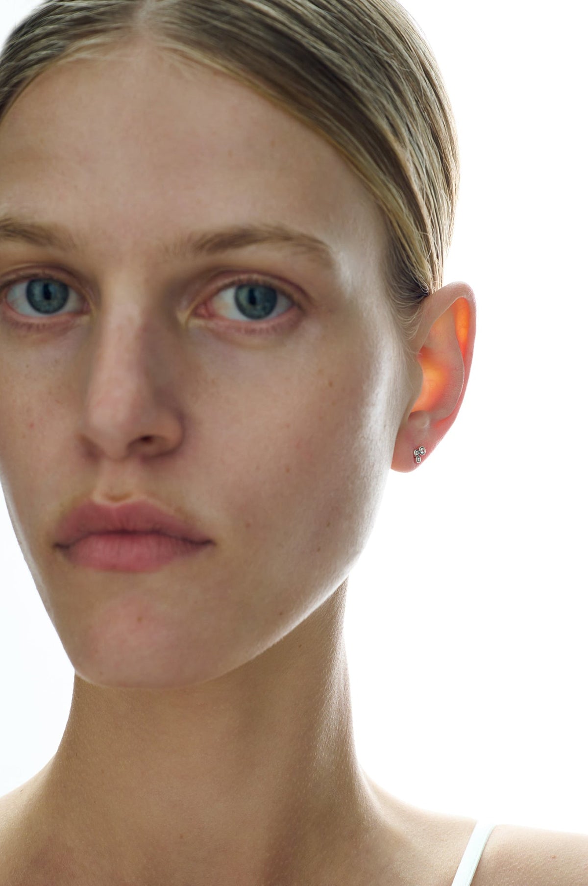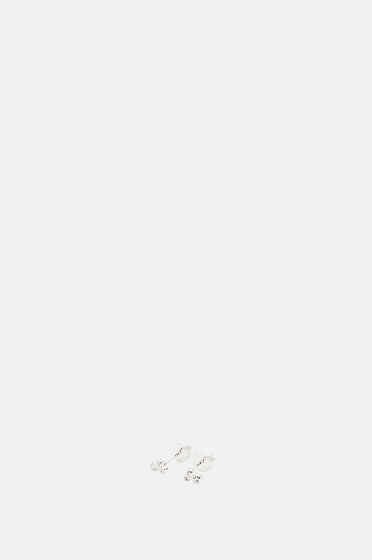 A pair of mini ear studs in 925 sterling silver, featuring three bezel-set crystal white CZ stones in different sizes. A feminine and versatile design and a perfect jewelry staple.