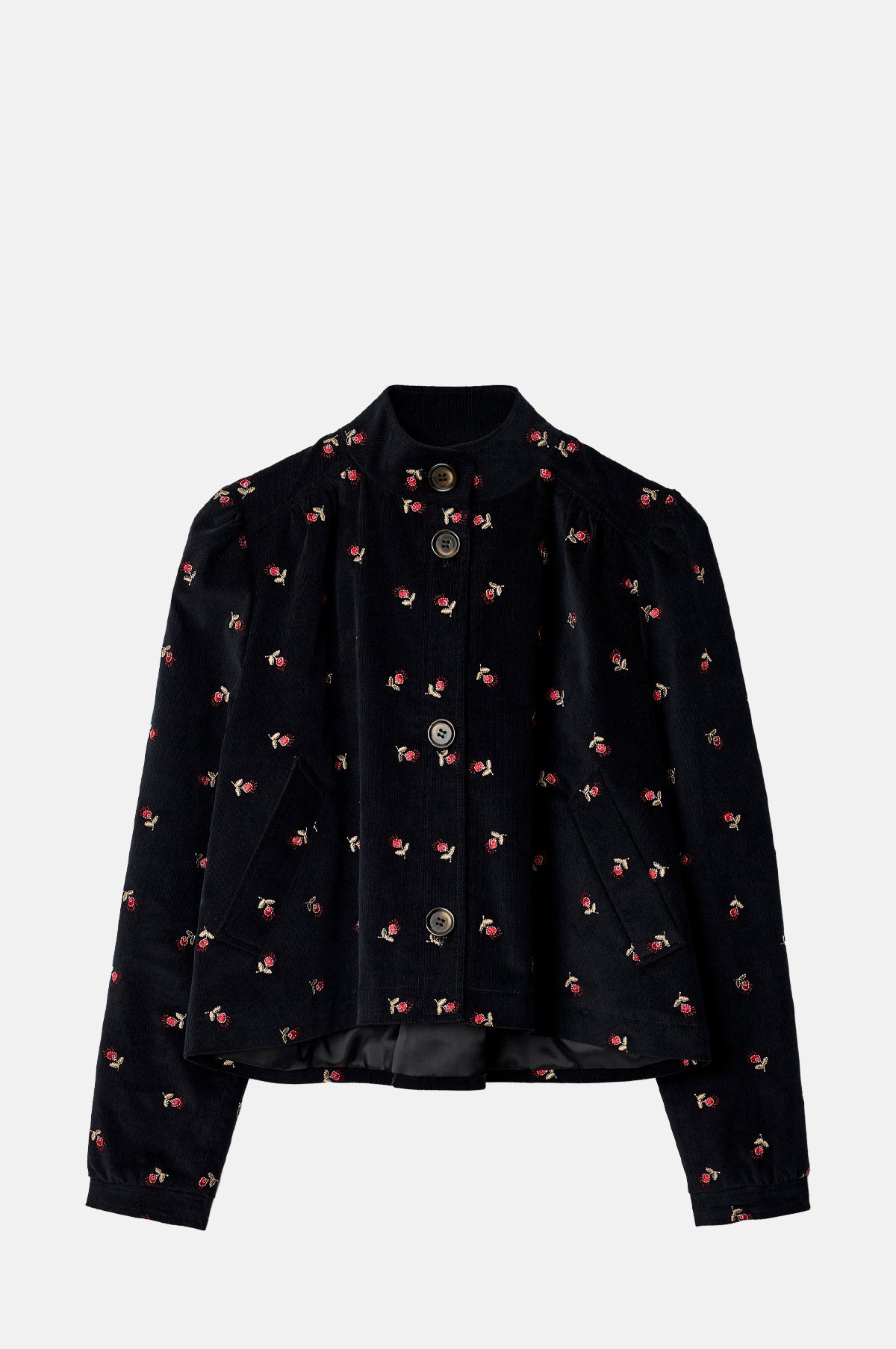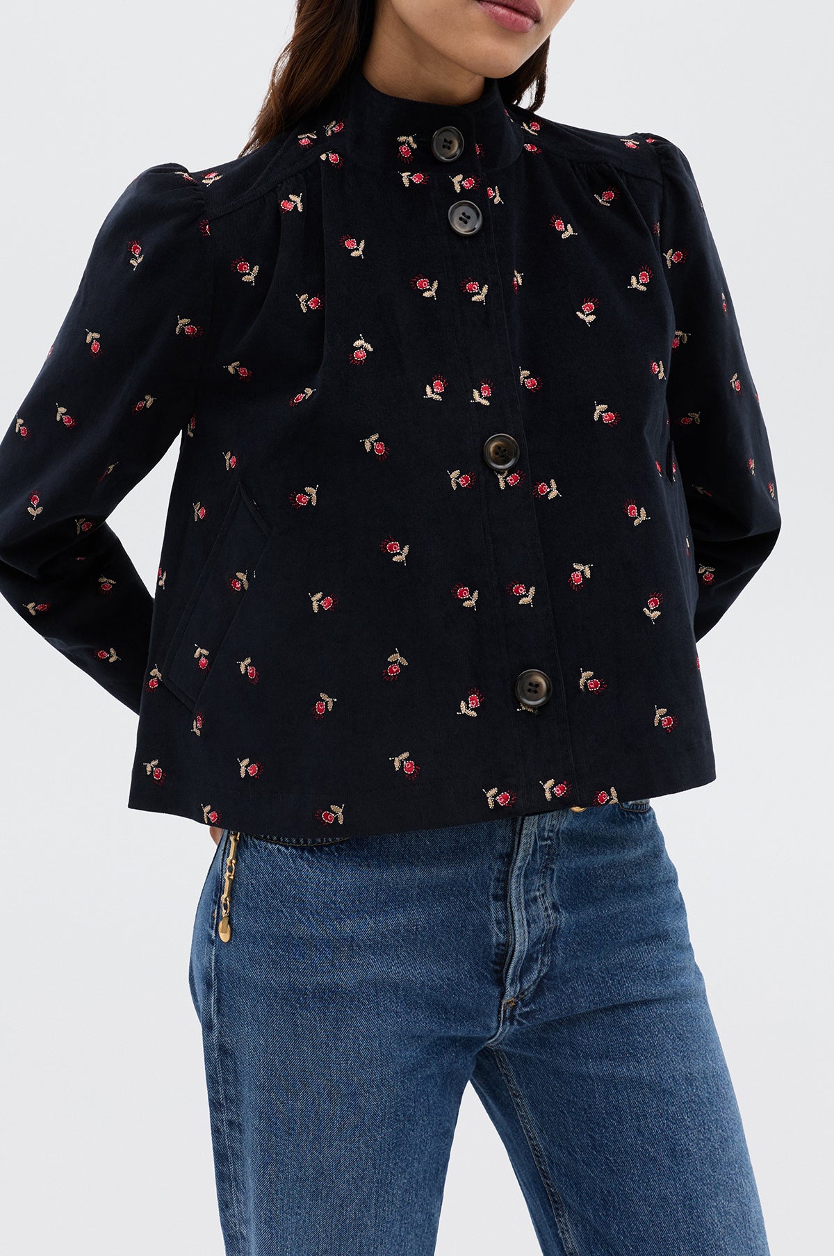 Inspired by the '60s, the Nyla jacket from Rixo offers timeless versatility. Cut from a plush navy baby cord and embellished with delicate floral embroidery, this jacket is defined by its cropped silhouette. Subtle volume at the hem and roped shoulders provide structure to the jacket and a button-front closure ensures ease of wear. Blending vintage charm with modern elegance.