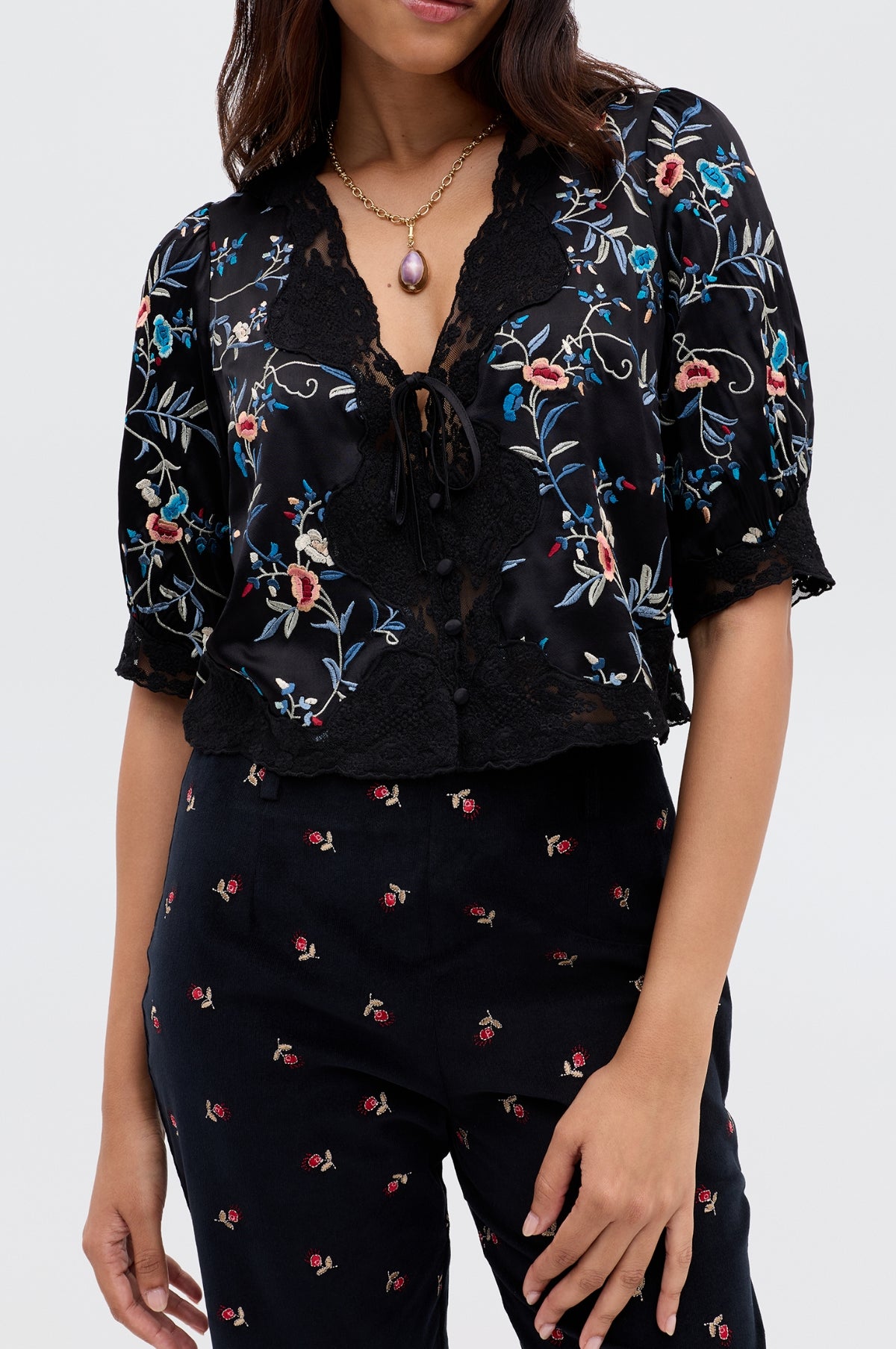 A signature Rixo style, the Ursula Top exudes vintage glamour. It's crafted from silky satin and finished with delicate lace trim and a satin bow for a touch of romantic charm. Patterned with hand-painted botanical embroidery inspired by traditional chinoiserie, it's a statement piece that will elevate any outfit.
