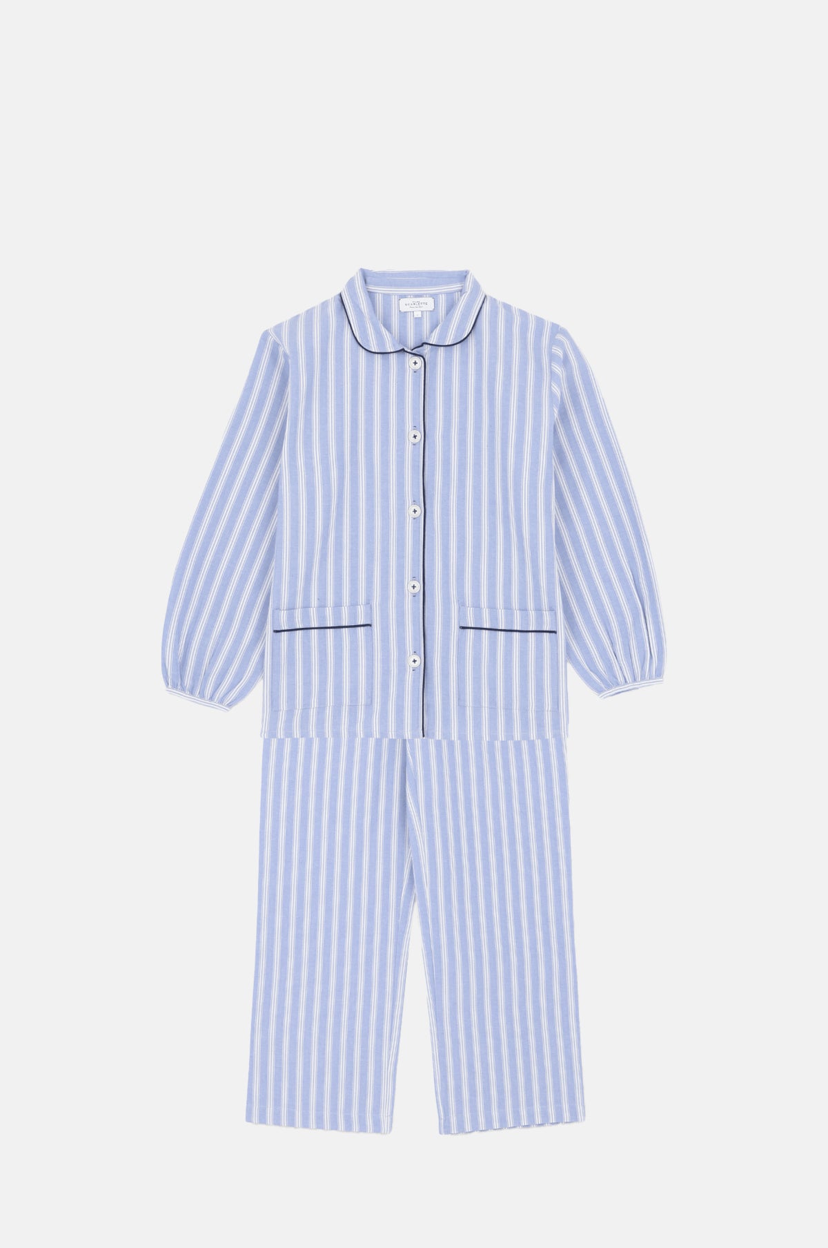 Woven from super-soft cotton flannel, this light blue striped pyjama set from Scarlette Ateliers is a chic and comfortable choice for duvet days. The jacket features a straight cut, long sleeves, and large buttons, while the trousers have an elasticated waist and practical pockets. Finished with a contrasting navy bias, relaxing has rarely looked so good.