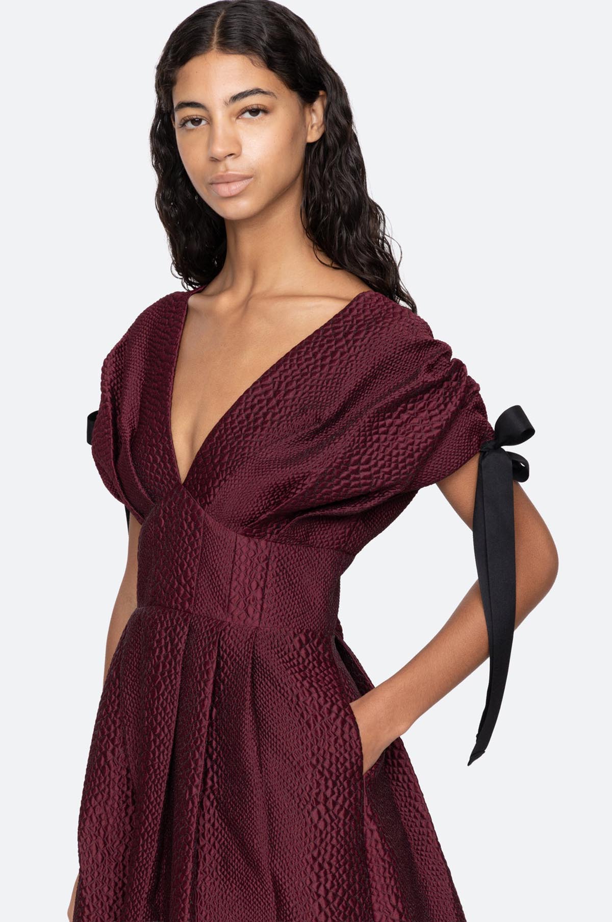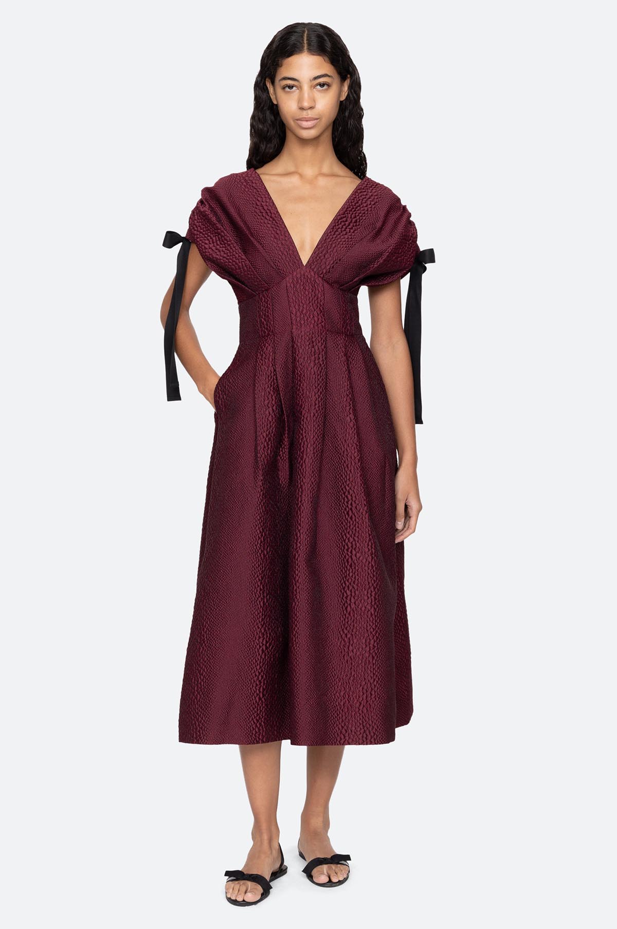 Sea New York are the masters of occasion wear and the Fayetta dress is very much deserving of a party. Cut in a timeless midi silhouette in a rich burgundy animal print jacquard, with structured pleating on the sleeves and bodice for added dimension. Delicate bow detailing on the sleeves gives this dress an elegant feminine touch.