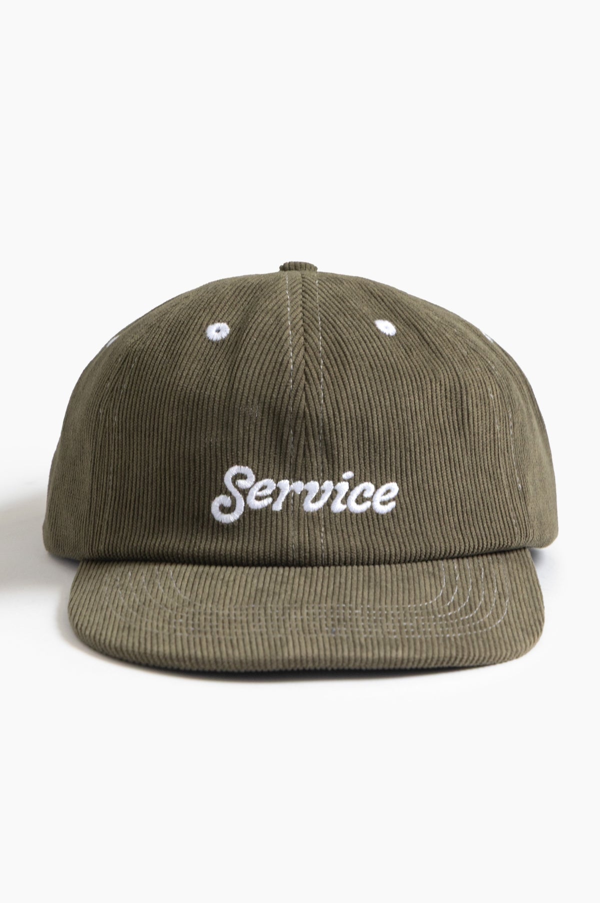 The Service Script Cap is a classic corduroy six panel camp hat with a low profile fit. This Forest coloured version features an embroidered script logo in white at the front and has a concealable nylon webbed strap for the perfect custom fit.