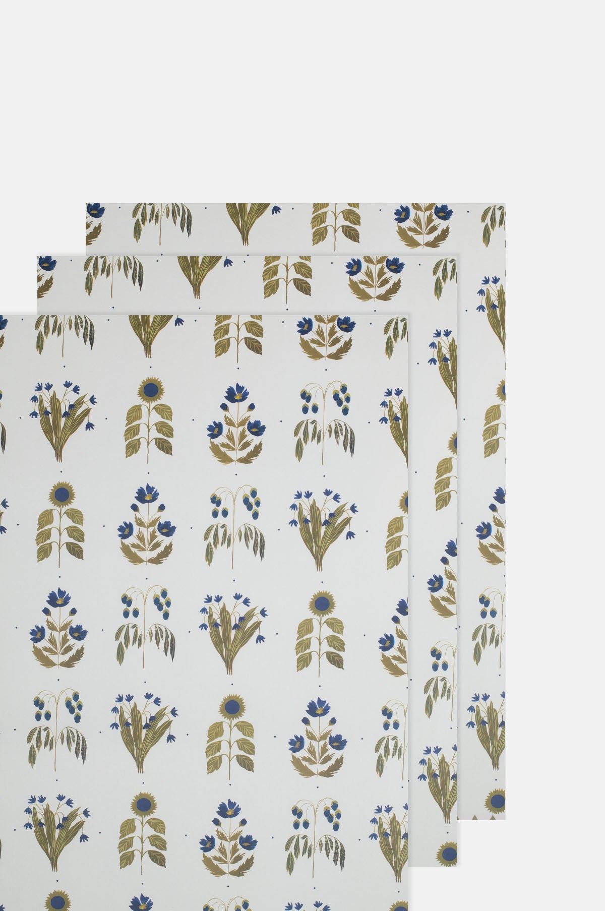 Four Floral Blue Botanical Wrapping Paper Set of 3 Sheets