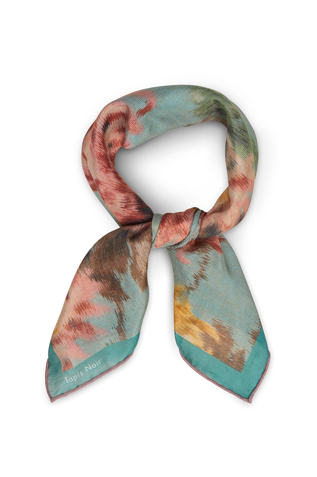 - Small cotton and silk scarf with a pink, yellow and brown abstract floral print on a blue/green background with a teal border.