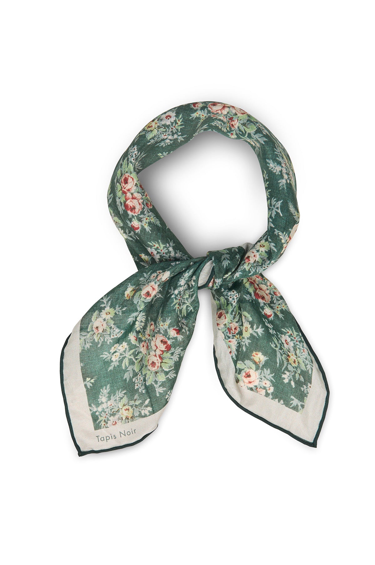 This small square, beautifully soft, cotton and silk green scarf features a floral print from their antique fabric archives that originated in France from the late 1800's. The edges have been rolled and sewn by hand - a time-intensive process that gives the scarf a very handsome hem. The petite handkerchief size makes it the perfect finishing flourish to your outfit of hairstyle.