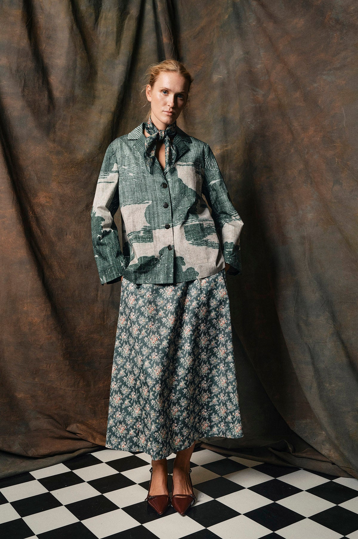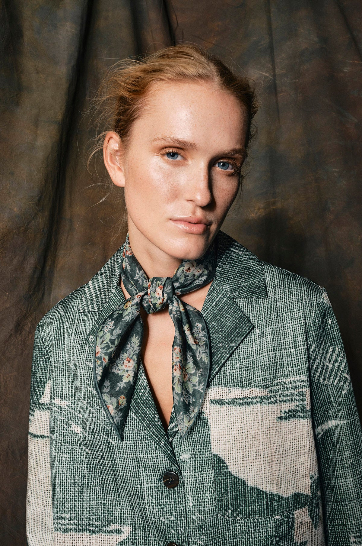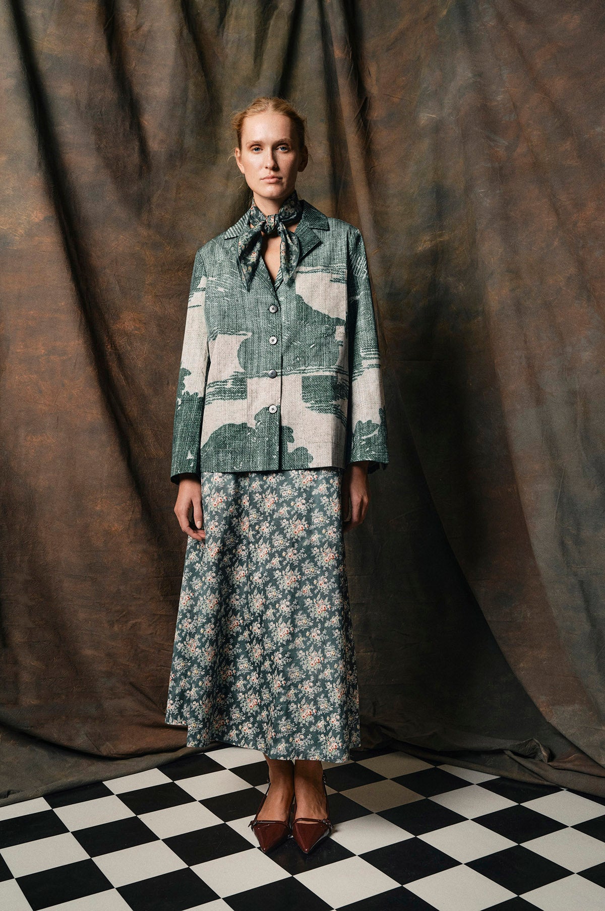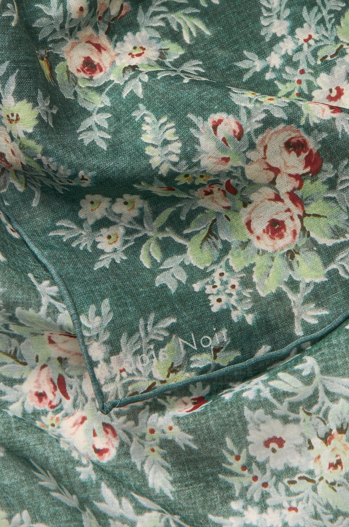 This small square, beautifully soft, cotton and silk green scarf features a floral print from their antique fabric archives that originated in France from the late 1800's. The edges have been rolled and sewn by hand - a time-intensive process that gives the scarf a very handsome hem.
