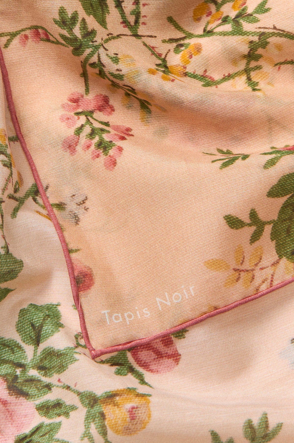 - Small cotton and silk scarf with a green, yellow and pink floral print on a peachy beige background