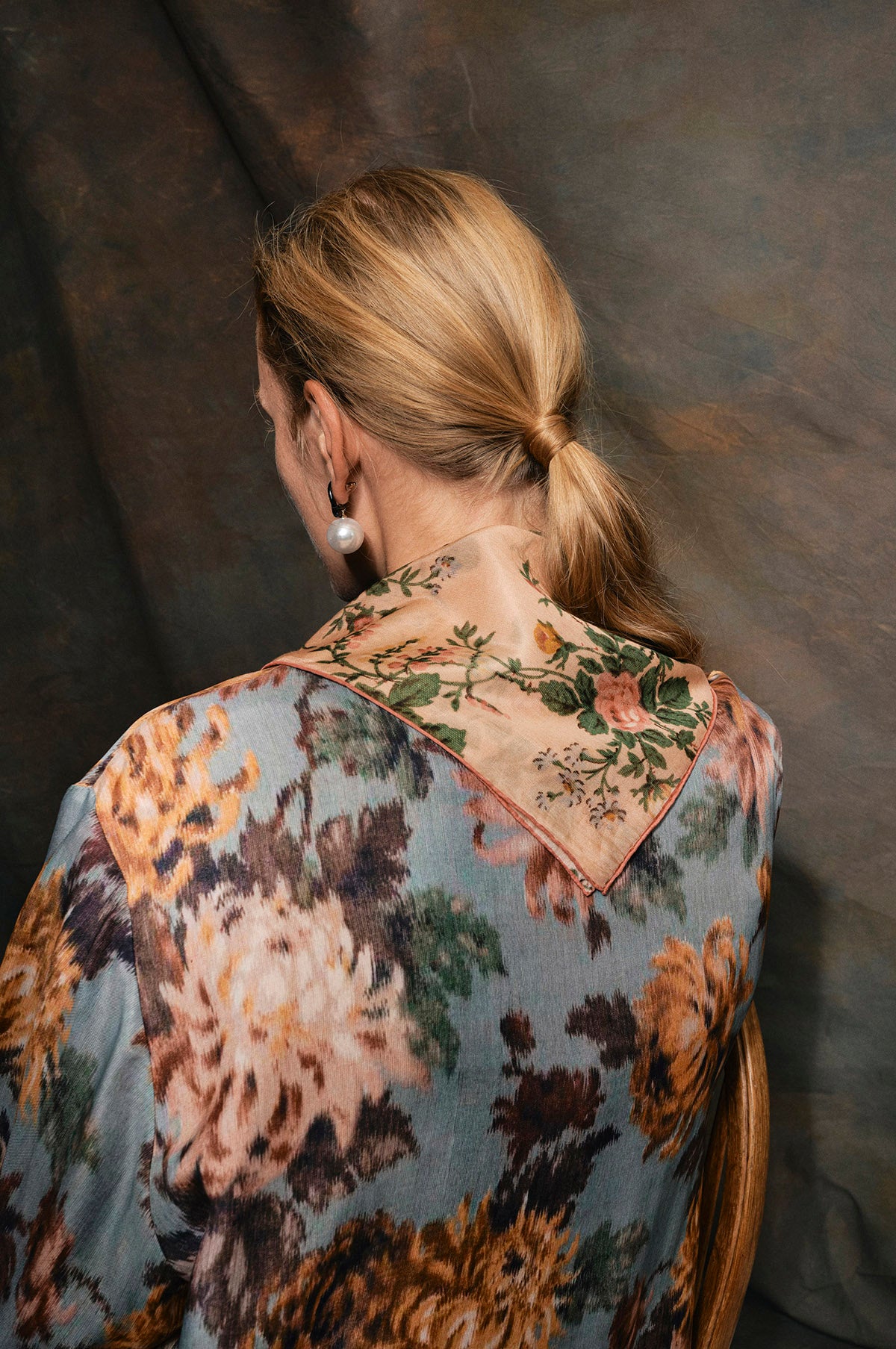 This small square, beautifully soft, cotton and silk peach scarf features a floral print from their antique fabric archives that originated in France from the early 1800's. The edges have been rolled and sewn by hand - a time-intensive process that gives the scarf a very handsome hem.