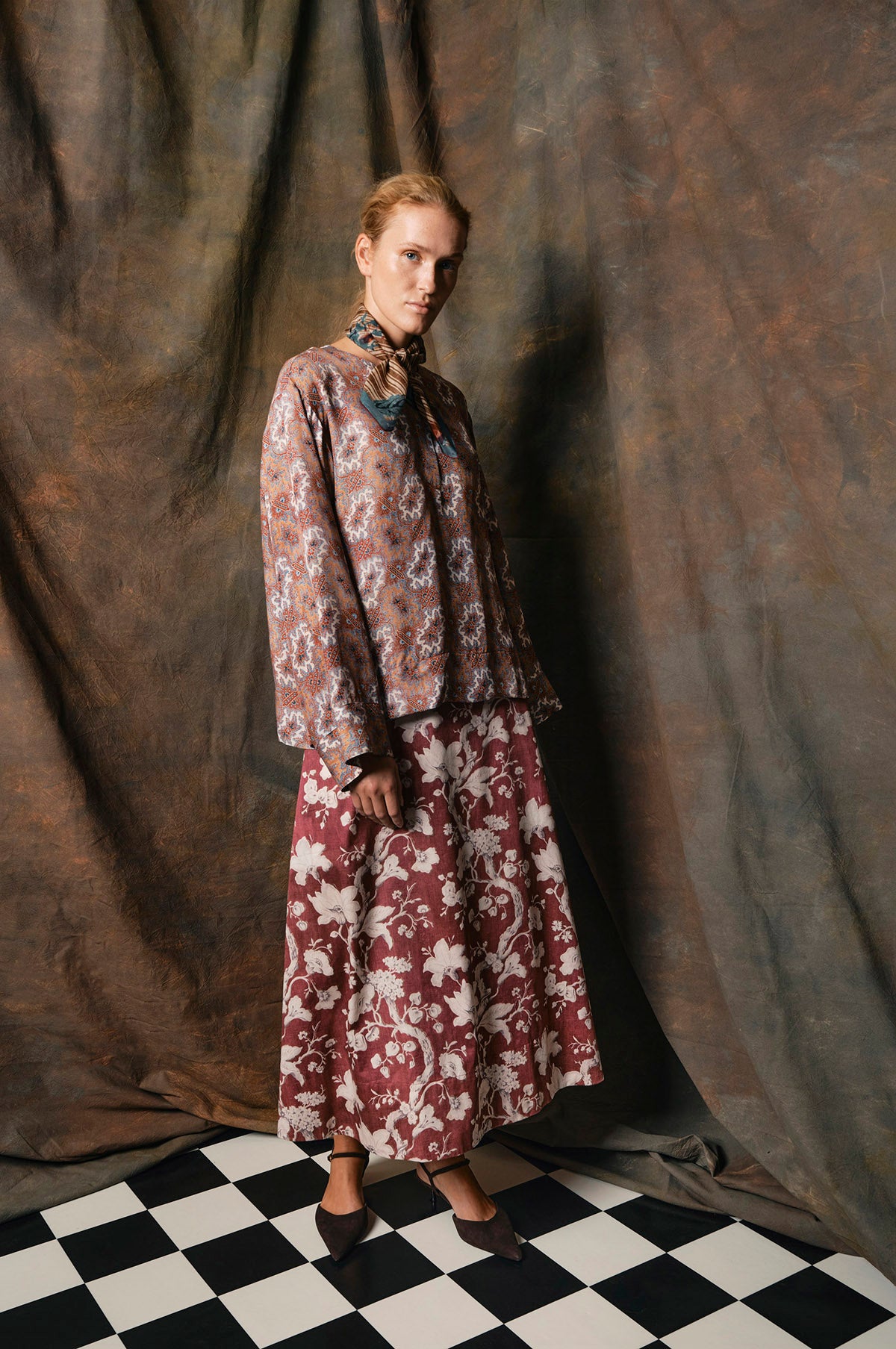 This small square, beautifully soft, cotton and silk brown and beige striped scarf features a rose floral print from their antique fabric archives that originated in France from the mid 1800's. The edges have been rolled and sewn by hand - a time-intensive process that gives the scarf a very handsome hem.