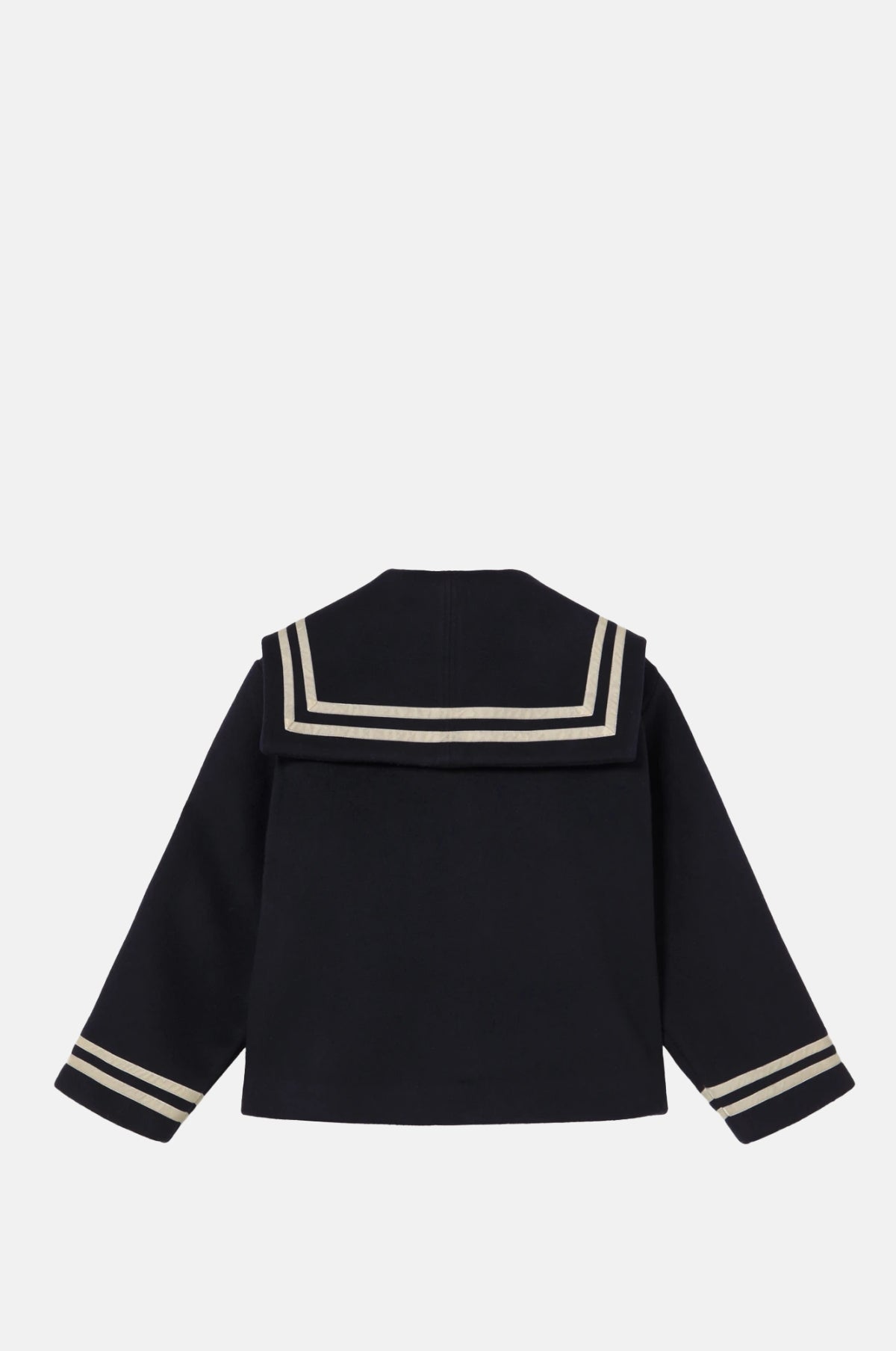Crafted from a navy wool blend, this coat features a V-neck statement collar, welt pockets, and a front opening secured with silver snap buttons. Fully lined for comfort, it is accented with contrasting tapes at the collar and hems, offering a subtle nod to nautical style. We love the mix of varsity and sailor styles with the result being a stand-out but cool and relaxed wool jacket.
