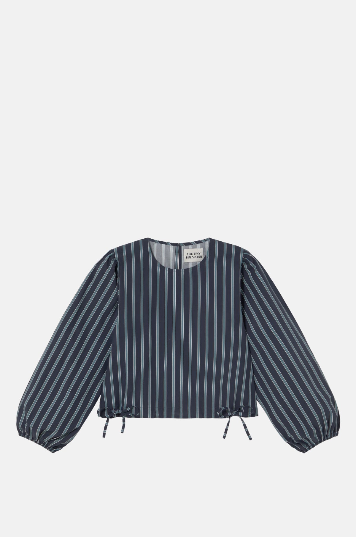 This lovely lightweight round-neck top is crafted from crisp pure cotton. Designed with voluminous sleeves, a gathered hem, and a button opening at the back, it has subtle structure with an airy silhouette. The navy colour base is lifted with a printed stripe. A great pairing with jeans or the matching TIny Big Sister Striped Volume skirt.