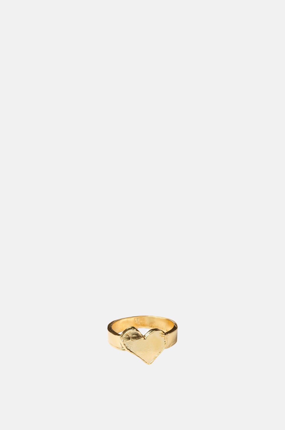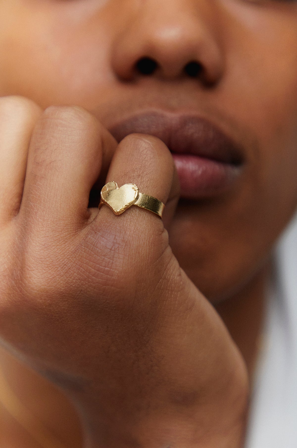 We love the modern finish to this hand-made heart gold ring. With a thick and rustically finished band and an asymmetrical heart, this is a cool modern piece with a romantic sensibility.