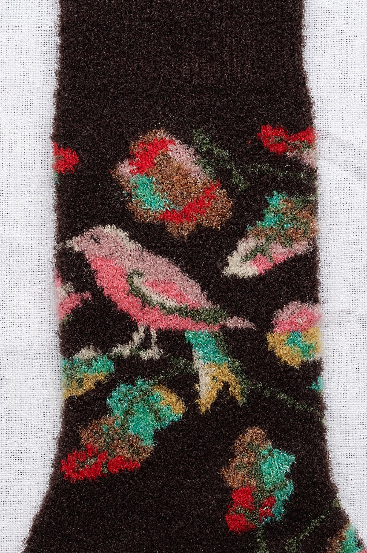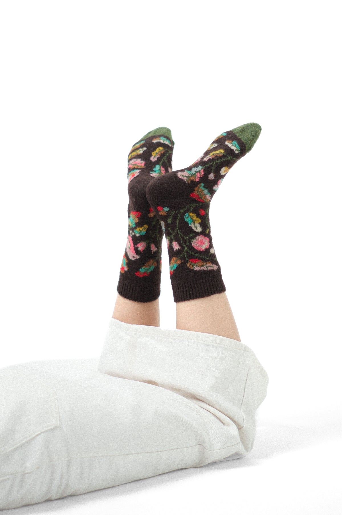 These socks from Bonne Maison are a wearable piece of art. Thick and super soft, these socks are woven from a wool blend with an elastane double thread. A floral print sits against a rich brown background and a moss green toe completes the sock.