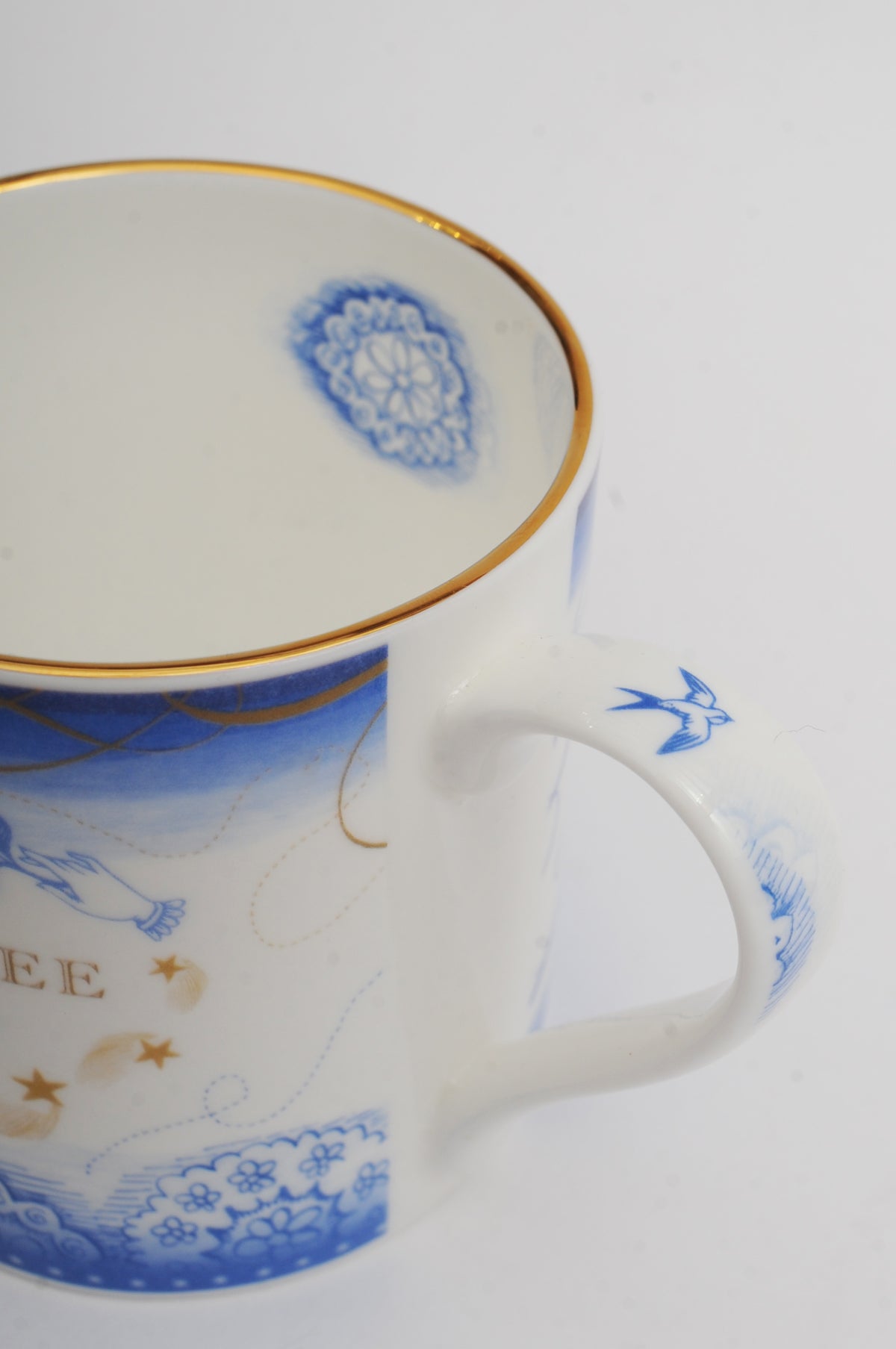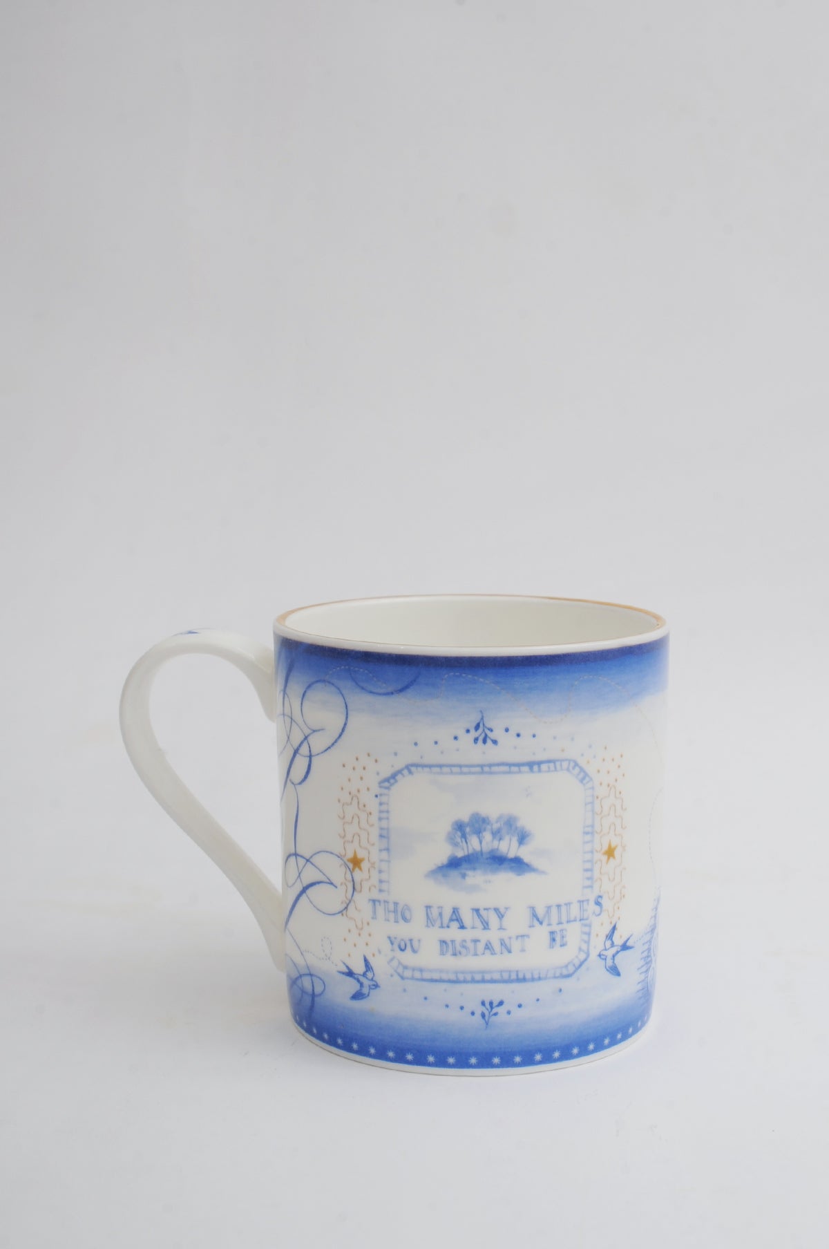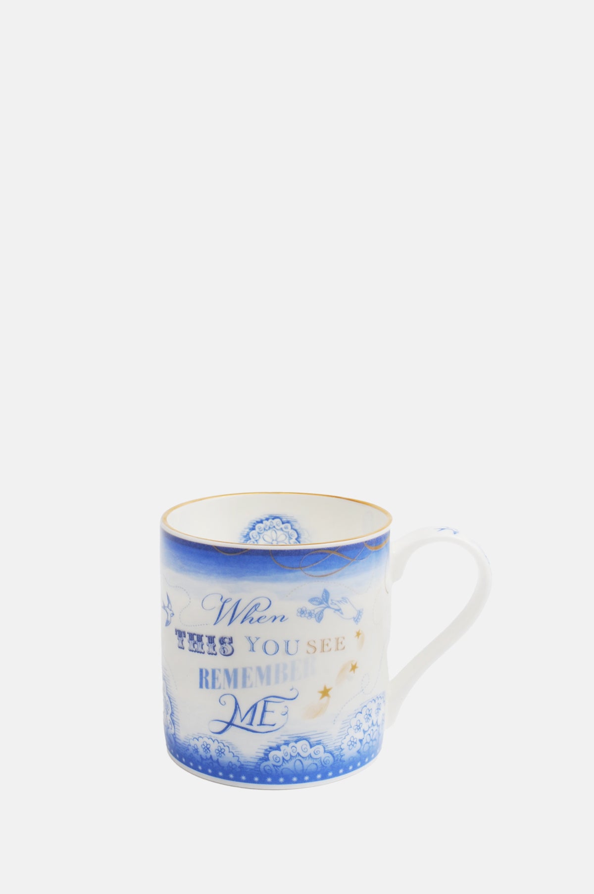 Hand decorated in Stoke by our new friends Mark and Eileen, the When This You See mug is made of bone china, in a palette of ultramarine and gold. Adorned with a heartfelt messages and whimsical illustations, it is generously but elegantly proportioned and complete with gold detailing around the rim. We love the bonus doodle on the inside.