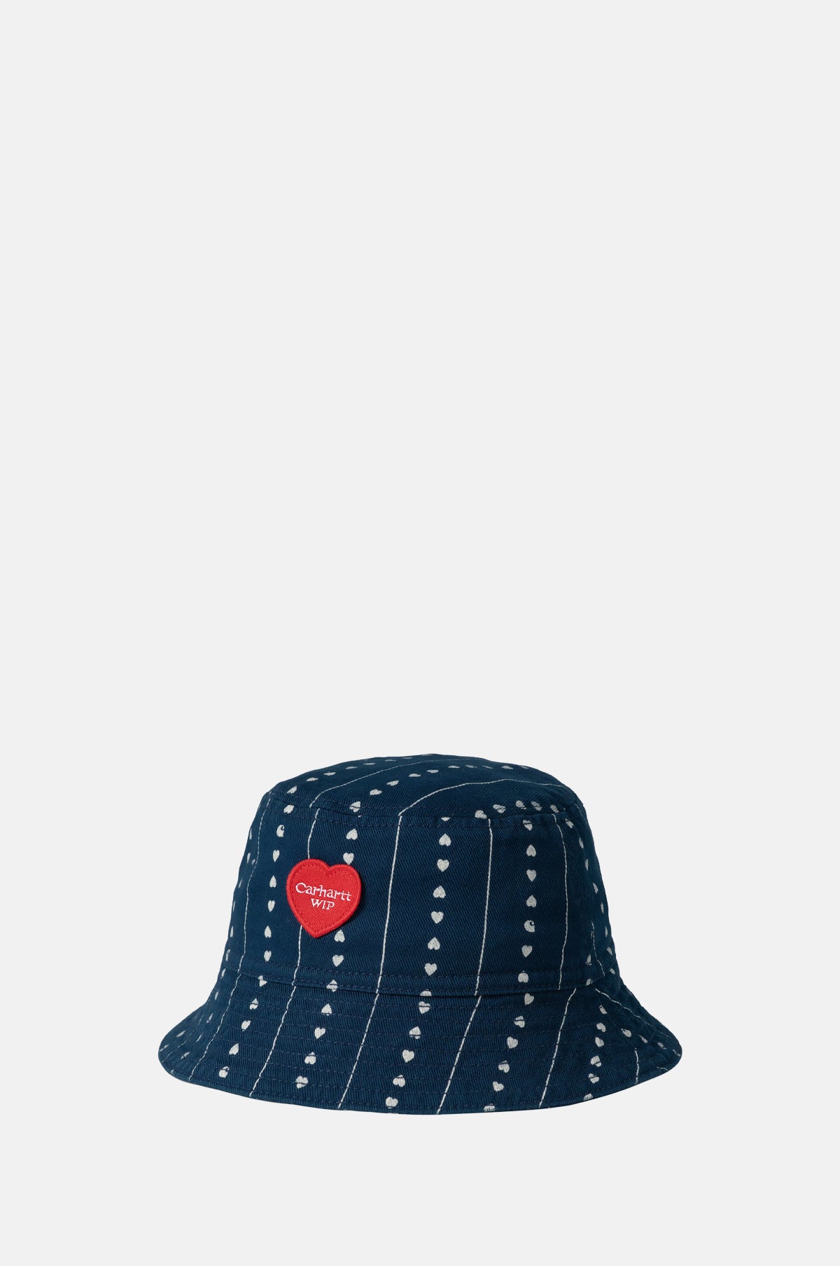 The Drewe Bucket Hat from Carhartt is made from a midweight cotton twill in an unlined, unstructured design. The item is detailed with a red heart patch on the front. This comes in two colourways: this one is dark navy with a white pinstripe and heart pattern.