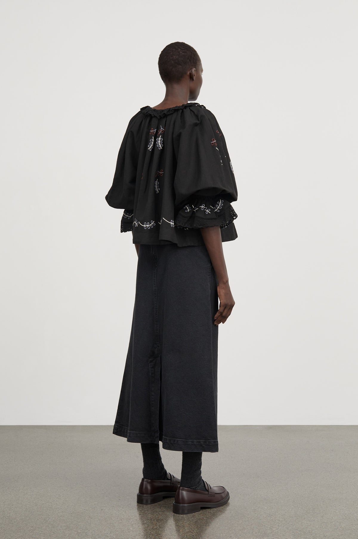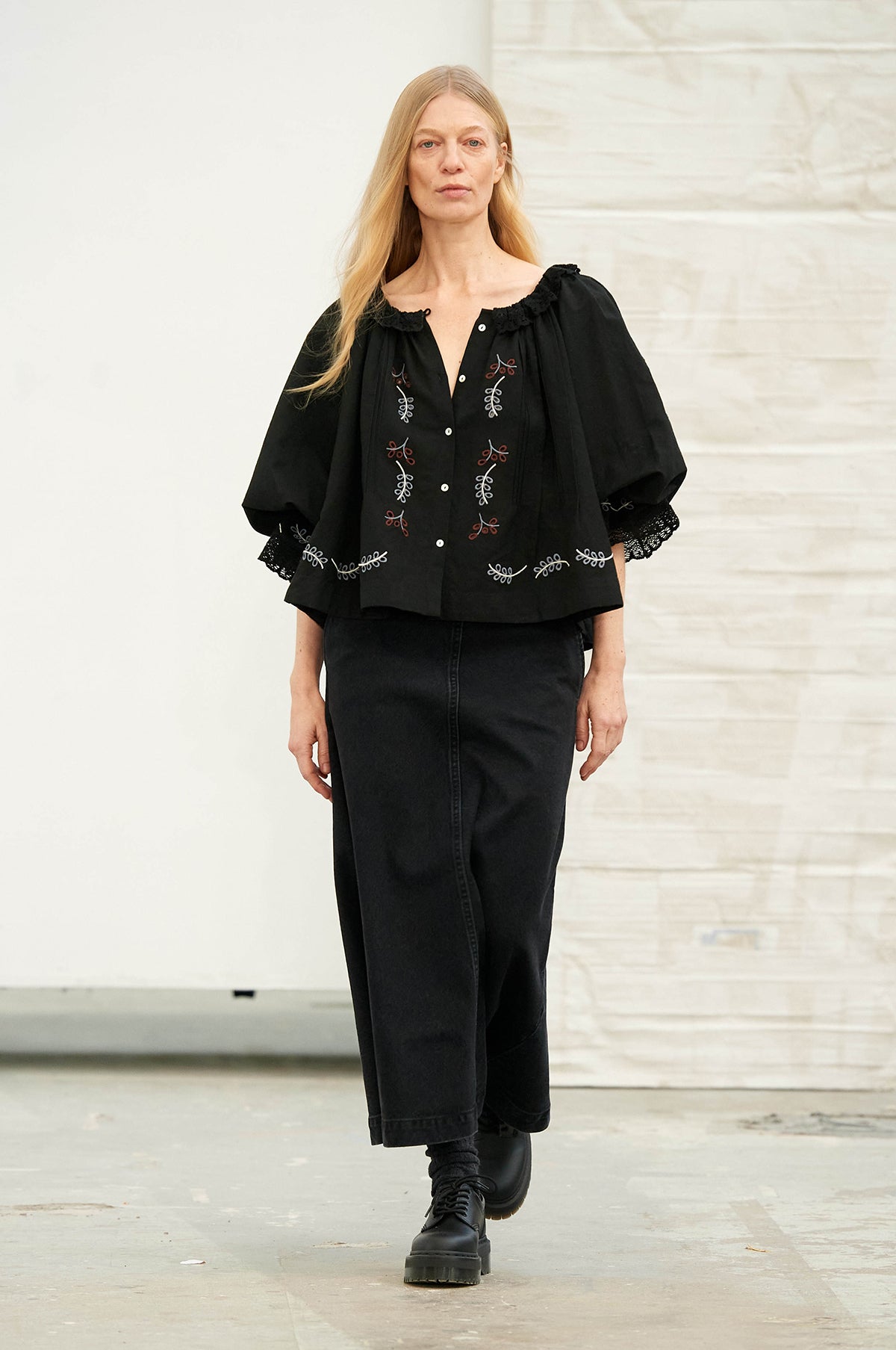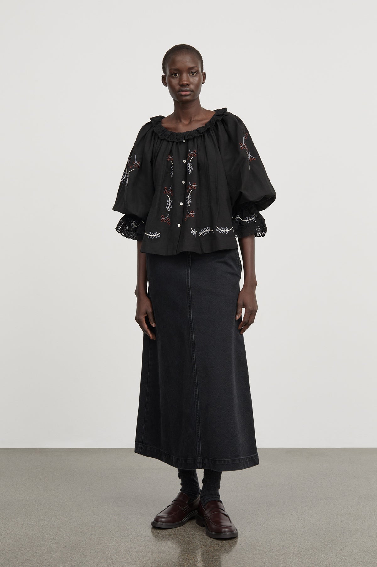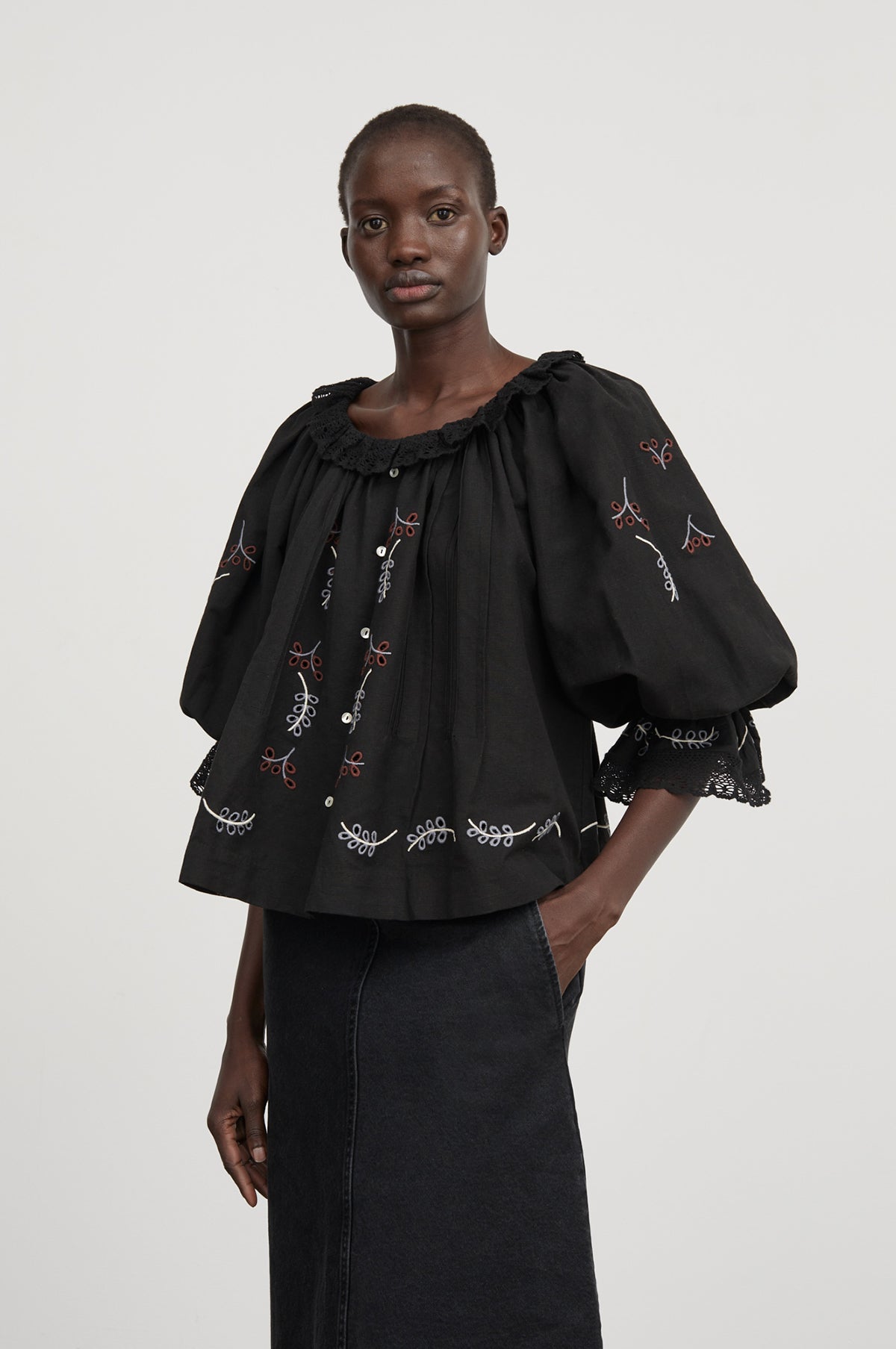 Made from a heavy linen and cotton blend, this feminine blouse from Skall Studios has a round neck with a lace collar and is buttoned all the way down. In a rich shade of black it has lace and embroidered detailing throughout and features long, voluminous sleeves with an elastic cuff. Oversized with a relaxed fit, this soft airy blouse is ideal for autumn.