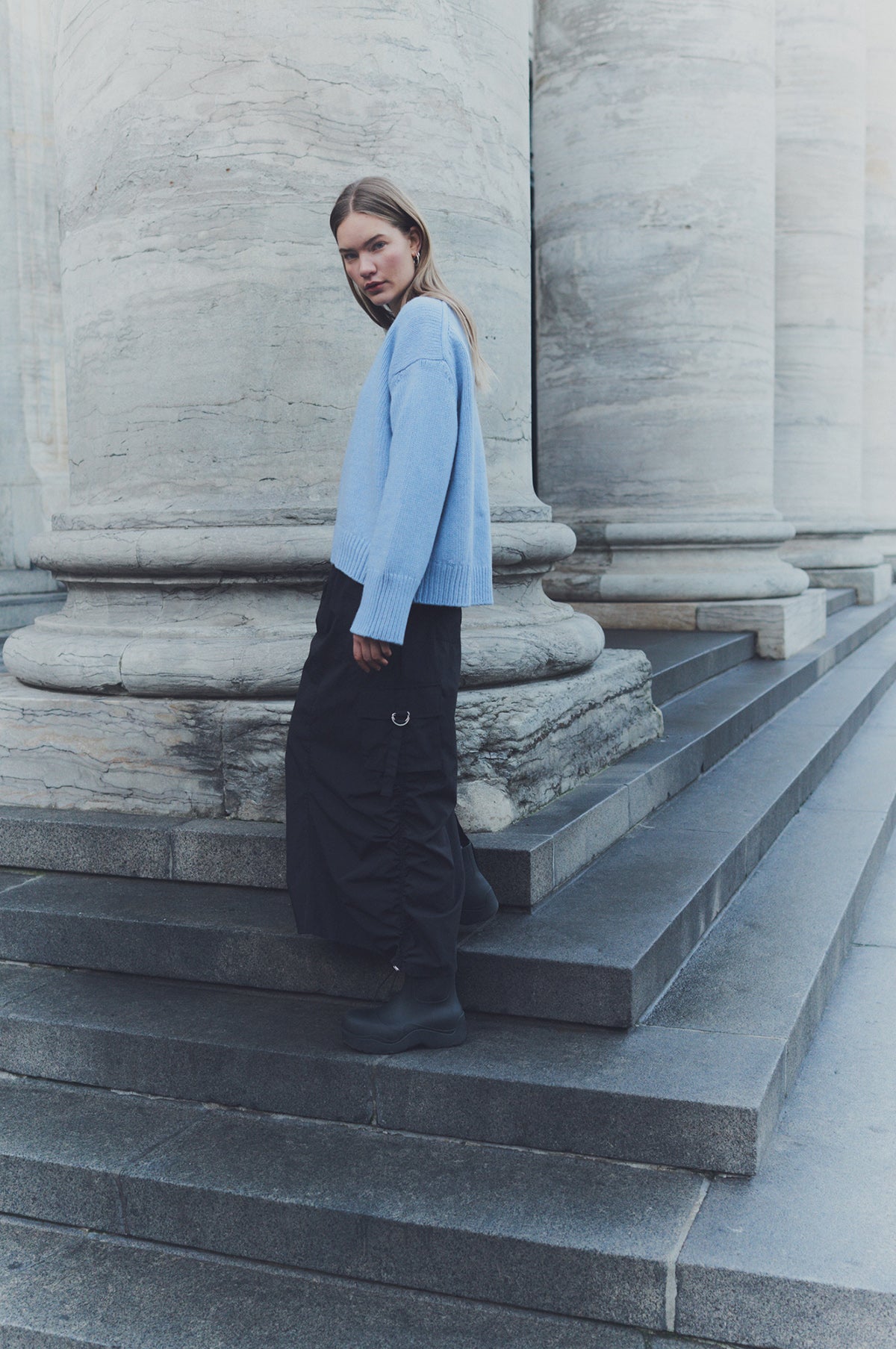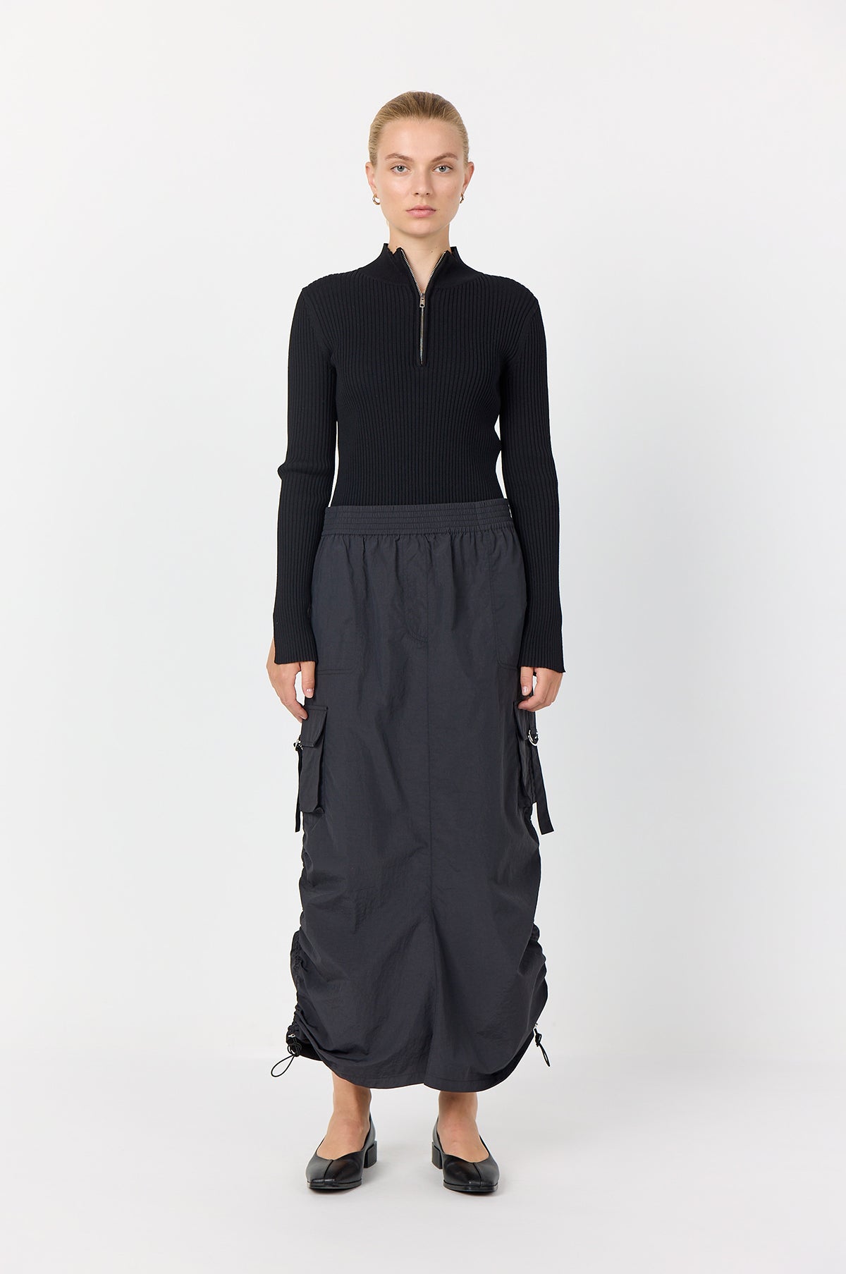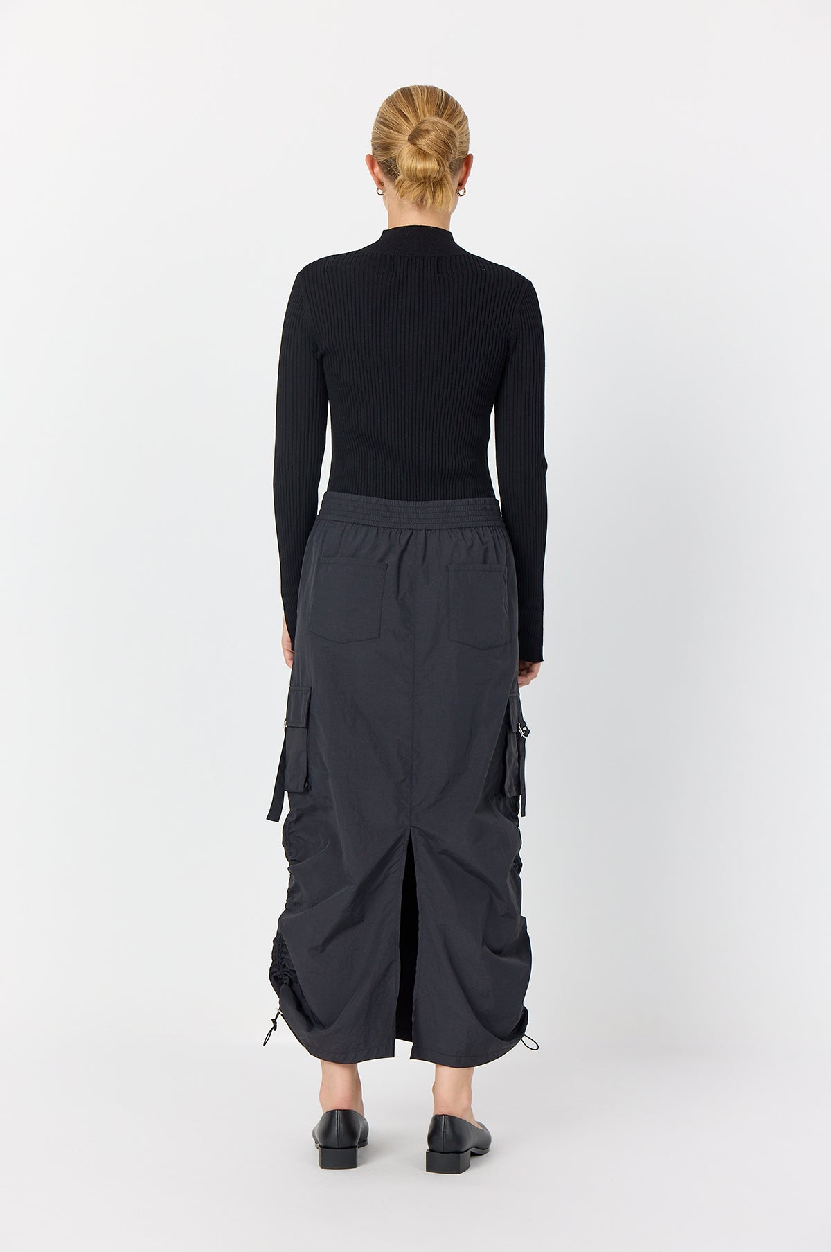 Achieve a sporty yet feminine look with this long cargo skirt. Designed with effortless style in mind, this skirt features side pockets with drawstrings, adjustable straps at the bottom of the skirt and an elasticated waistband. Easy to pair with a knitted jumper and chunky boots, this skirt will be a go-to addition in your wardrobe.