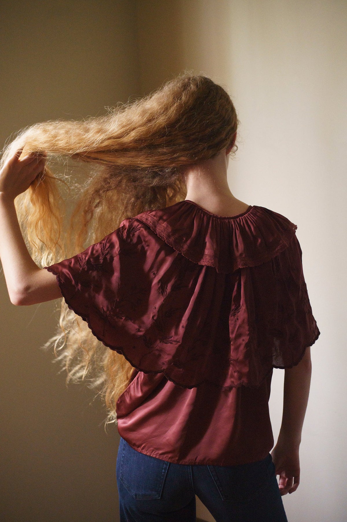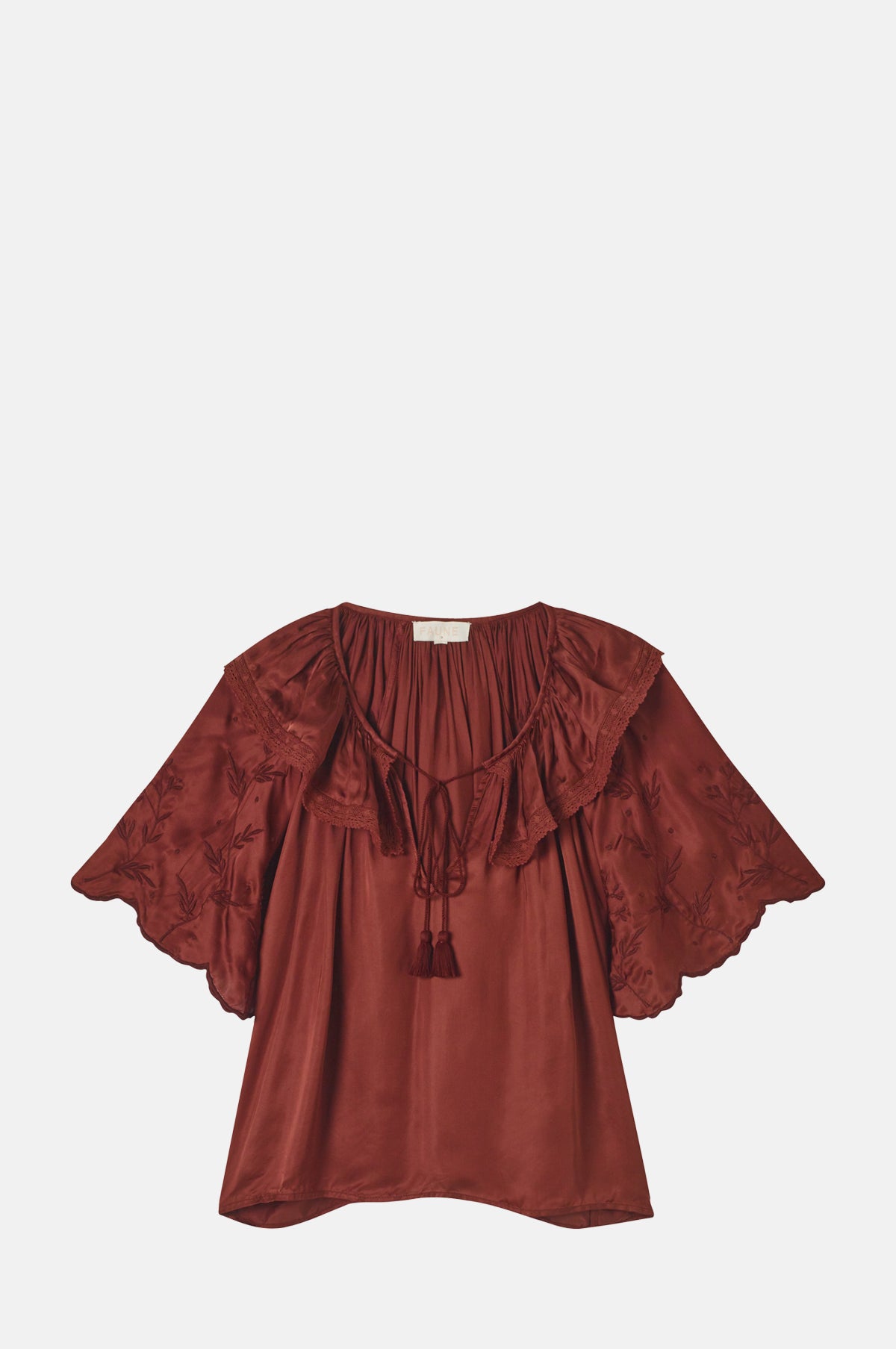 You heard it here first, the cape is back for autumn/winter and the Eden Blouse from Faune is nothing short of ethereal. Made from a fluid satin, it has a wonderfully luxurious feel and the burnt sienna shade is nothing short of divine. The angel sleeves continue into a stunning cape at the back which is finished with exaggerated scalloping and delicate embroidery. Heavily considered it includes a cute frill collar with lace trim that frames the neckline as well as a front opening fastened with an elegant cord tassel tie. The epitome of Bohemian femininity, this blouse is easily dressed up or down. We like pairing it with denim for a more relaxed daytime look.